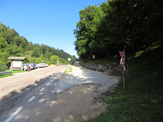 Dopo l'ultimo tornante (il 14°) si attraversa il confine Veneto-Trentino arrivando a Pian delle Fugazze. Subito dopo le tabelle di confine inizia la Strada degli Eroi.