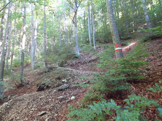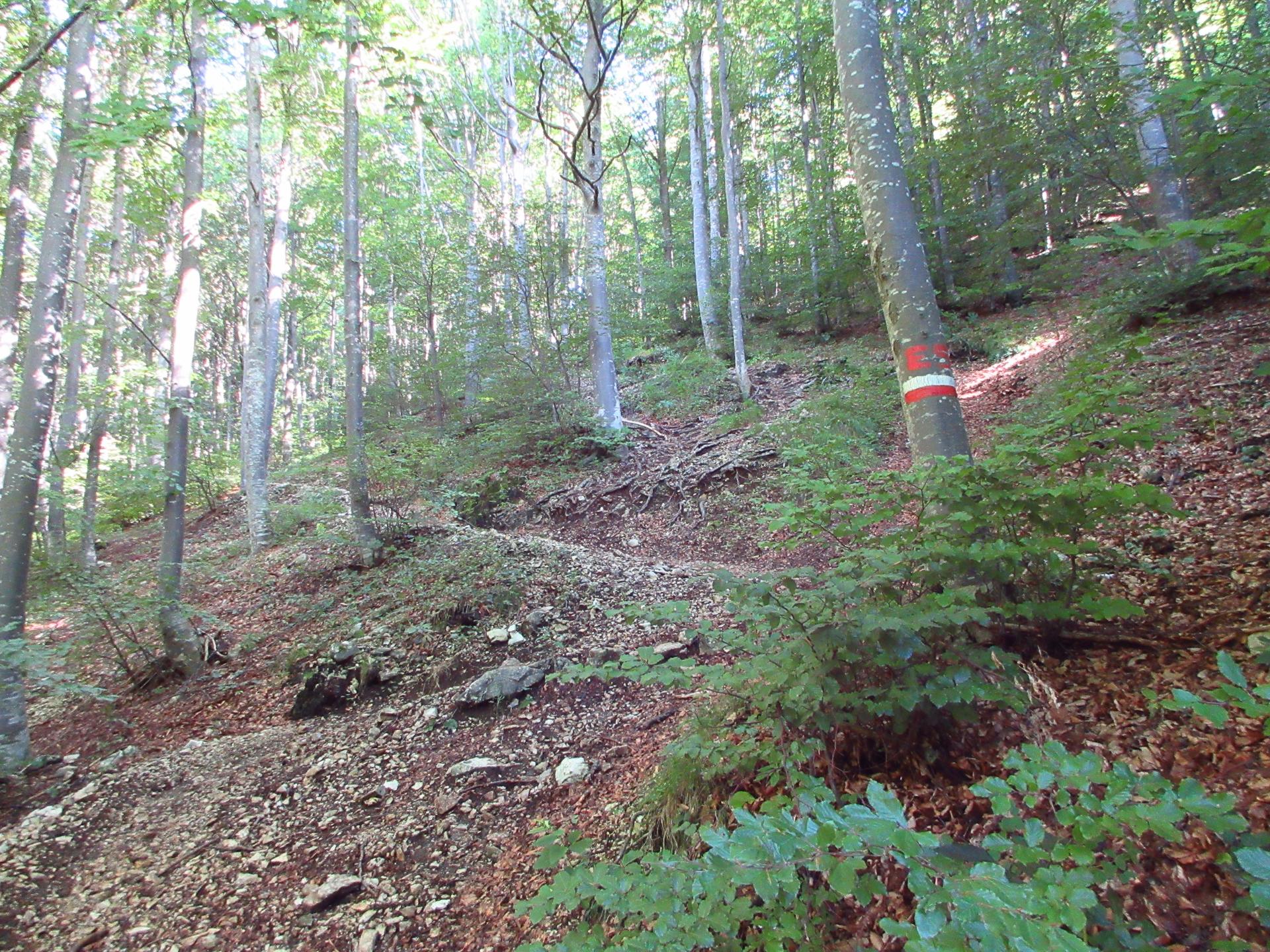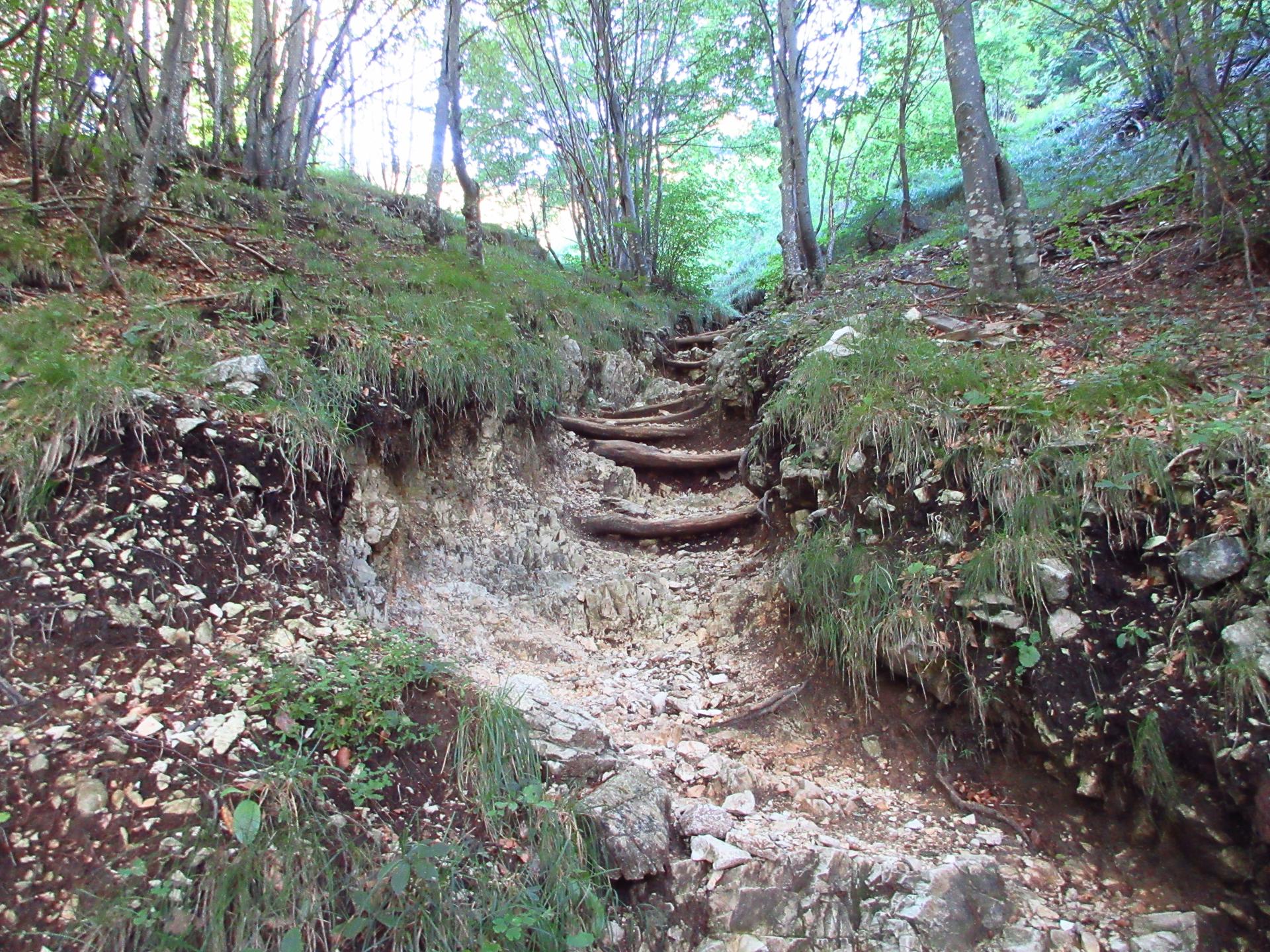 Il sentiero è percorso da molti escursionisti ma non è molto ben segnalato. Usciamo dal tornante per affrontare una specie di scala che riporta subito in strada.