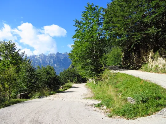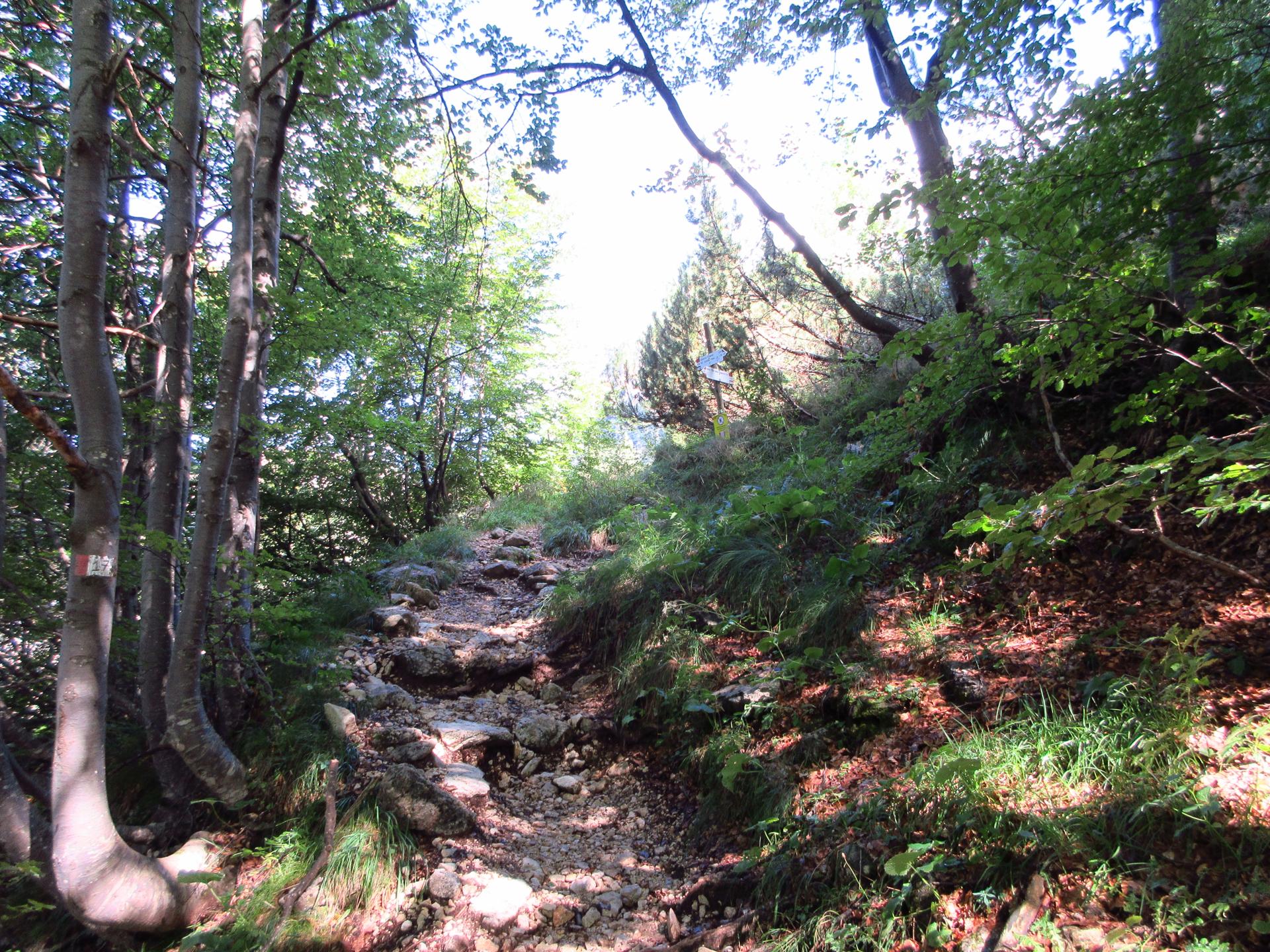 Al terzo tornante si trovano le indicazioni per il sentiero europeo E5 che, con un percorso più breve, porta sempre al rifugio. Decidiamo di seguire l'E5 in salita e di fare la strada completa solo in discesa.