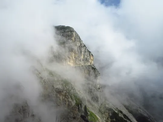 Le nuvole sembrano giocare con le rocce, le avvolgono, le nascondono per poi farle valorizzare al sole.