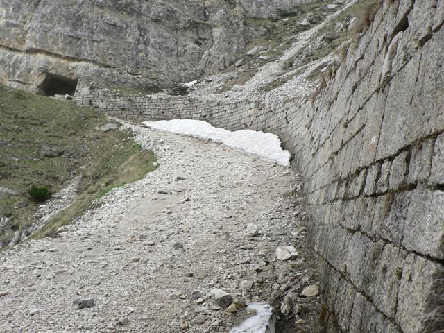 I massi, ricavati dalla vicina parete di M.te Forni Alti, furono abilmente quanto pazientemente scalpellati. Il volume complessivo del muro realizzato fu di circa 400 metri cubi. Data la particolare conformazione, questo tratto era quasi interamente coperto da strutture paravalanghe.
