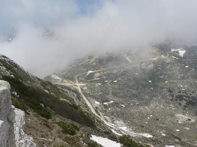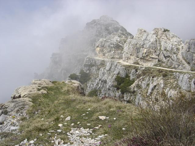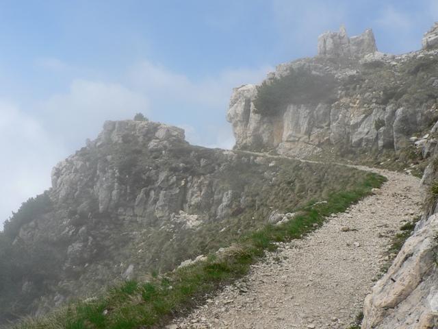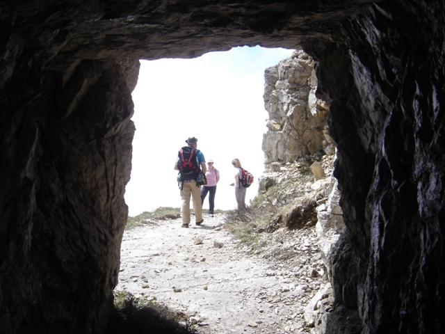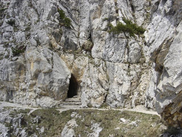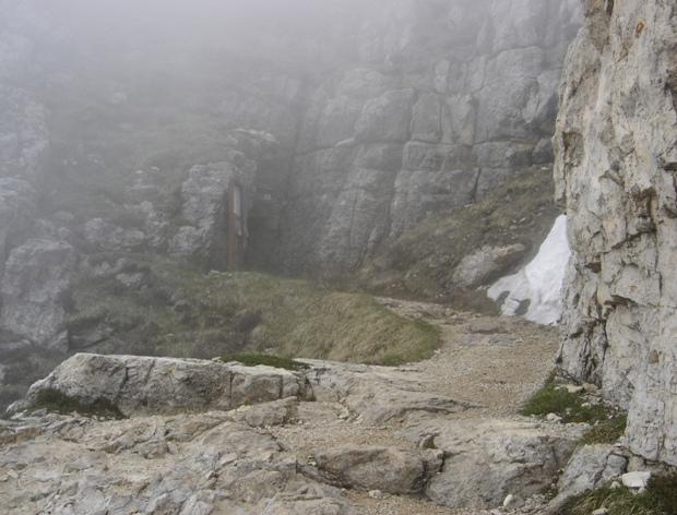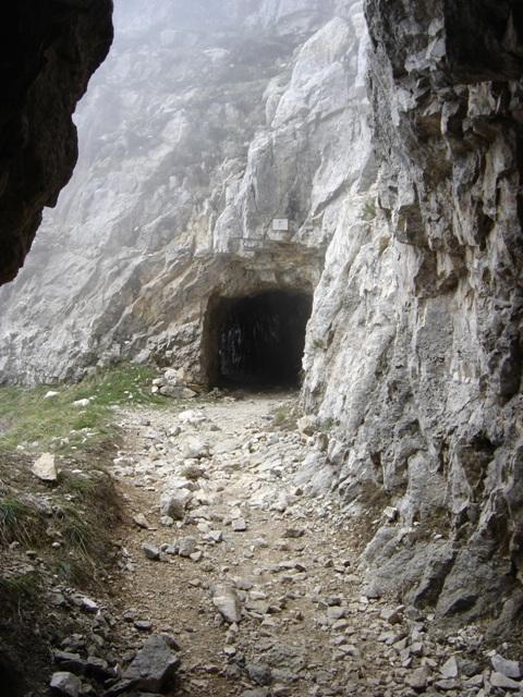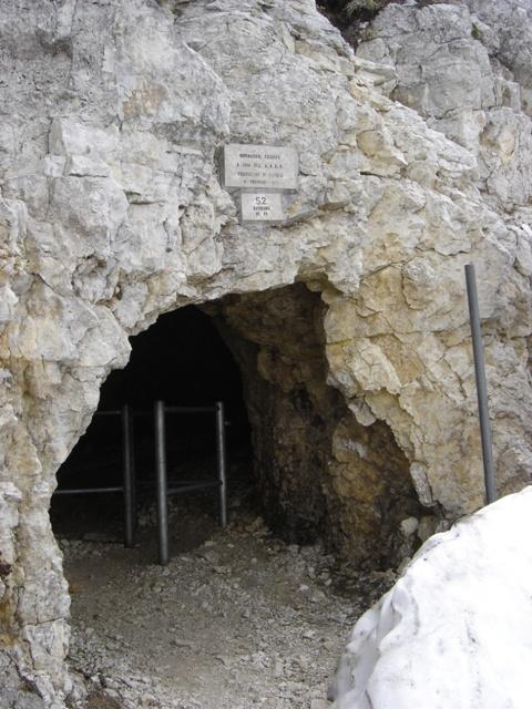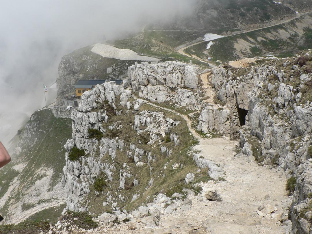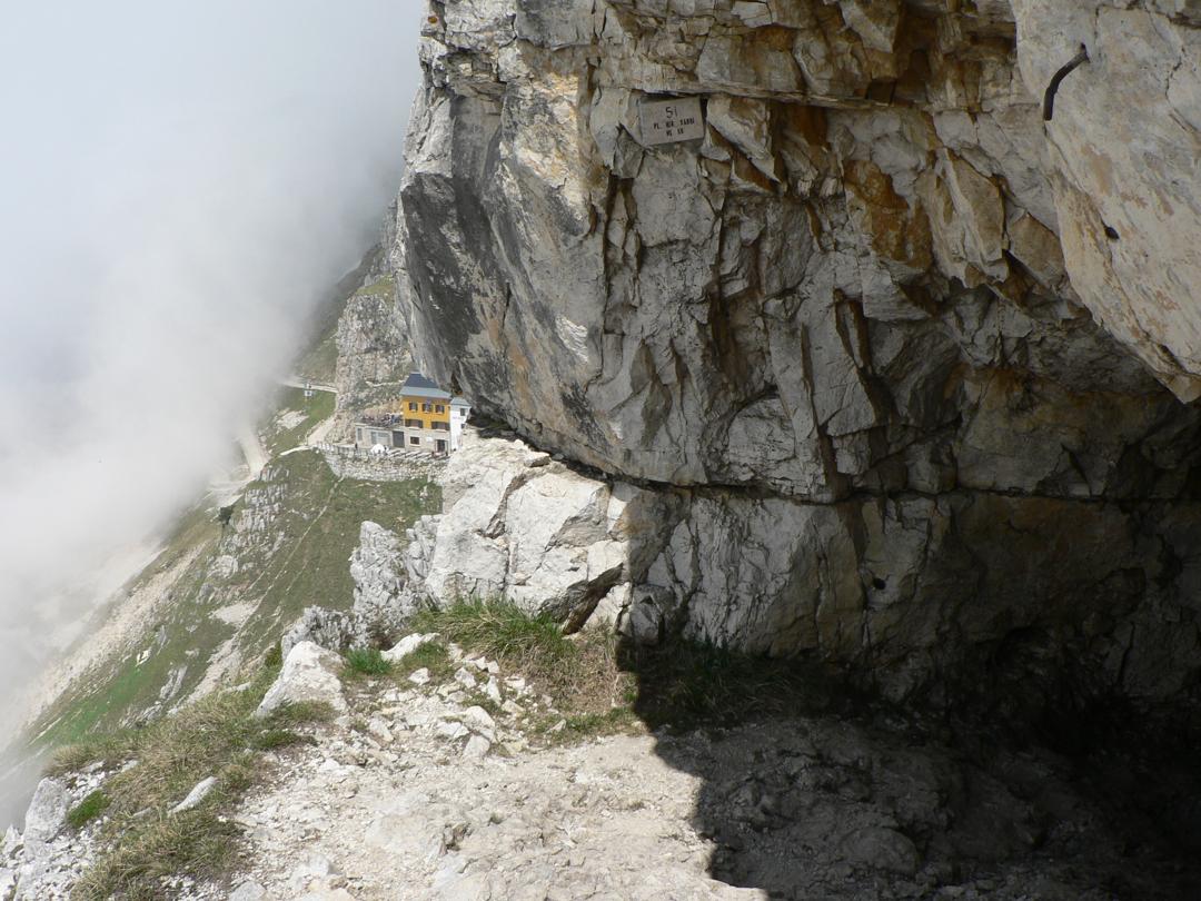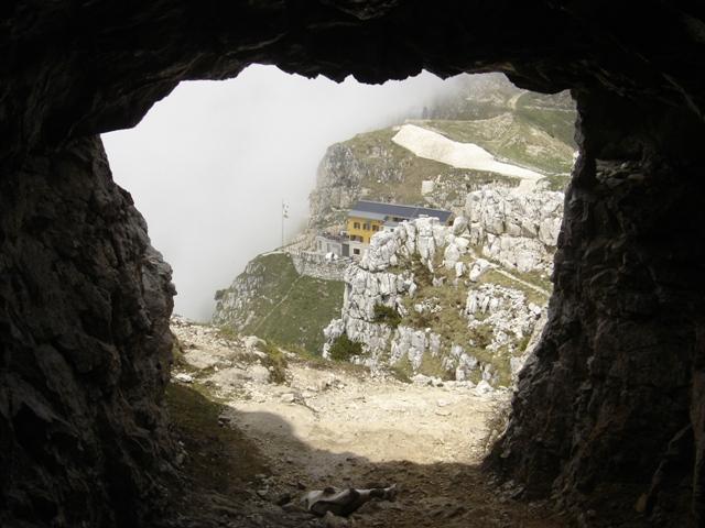 Qui la discesa si accentua e nell'oltrepassare i resti della stazione d'arrivo di una teleferica, di alcune postazioni di artiglieria e di ricoveri, si entra in alcune gallerie a gradinate fino ad arrivare all'ultima che cala ripidamente per sbucare nell'intaglio di Porte del Pasubio e, di lì a pochi metri al rifugio Gen. A. Papa (mt.1928).
