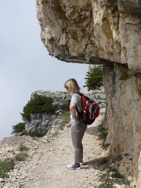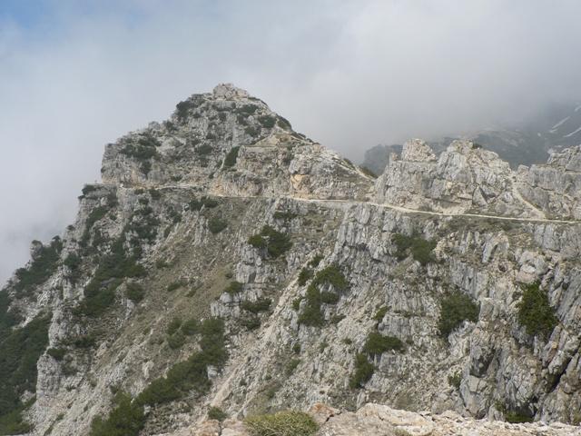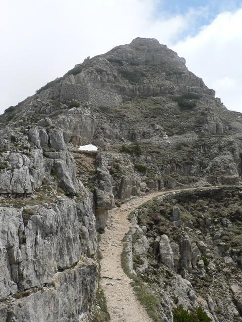 La mulattiera prosegue attraverso i resti di alcuni manufatti che testimoniano di un luogo densamente abitato di ricoveri, baraccamenti per le truppe a riposo, alloggiamenti per i servizi e per le artiglierie anche di medio calibro posizionate sulla cresta sovrastante. Ora la leggera discesa accompagna all'ultimo tratto della strada che nel percorrere una cengia a picco sul sottostante Vajo Sud prima e, sulla strapiombante Val Canale poi, offre in ogni momento scorci e aspetti ricchi di fascino e suggestione.