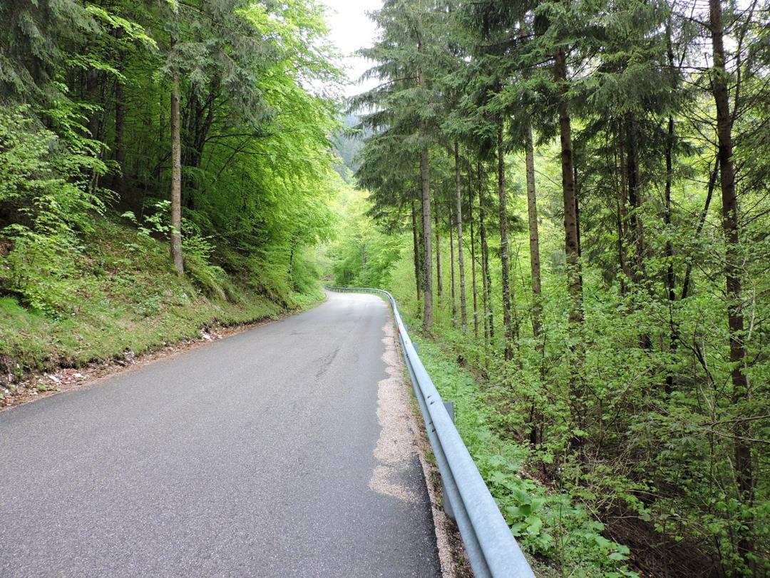 Terminata la discesa la strada attraversa un torrente con una secca curva a destra. Purtroppo un pezzo di strada è devastato dagli schianti degli alberi. Si riesce comunque a passare.