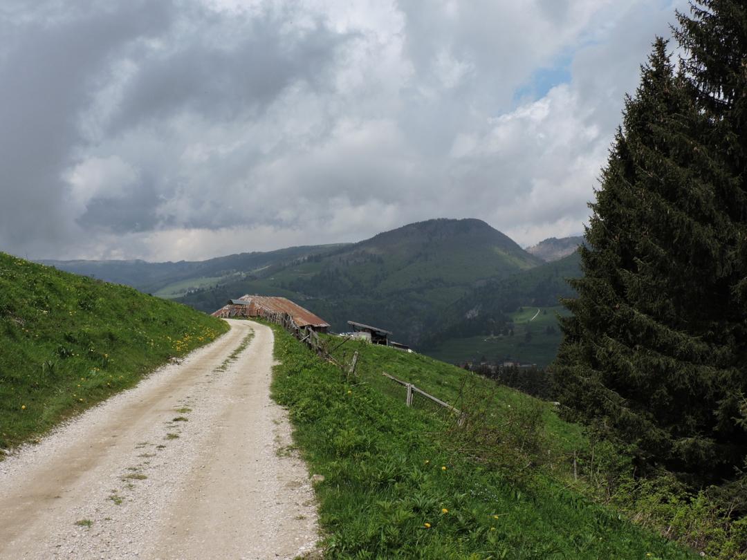 Si prosegue andando verso la malga e, poco prima dell'ingresso, la strada svolta a sinistra. Inizia la discesa, dapprima su un prato erboso per poi rientrare nel bosco.