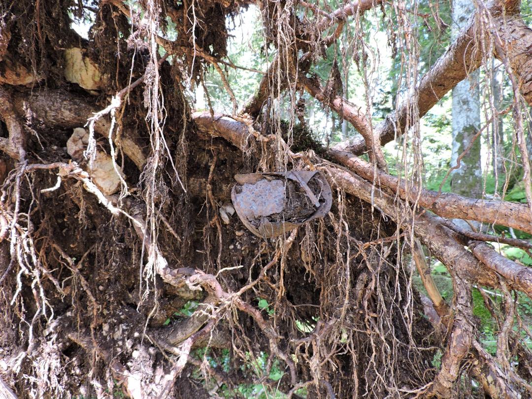 Sotto le radici di un albero caduto per la tempesta Vaia, si mette in mostra una scatoletta alimentare della Grande Guerra, per tanto tempo gelosamente custodita e nascosta dall'abete rosso e purtroppo tornata alla luce.