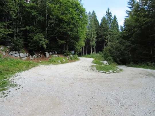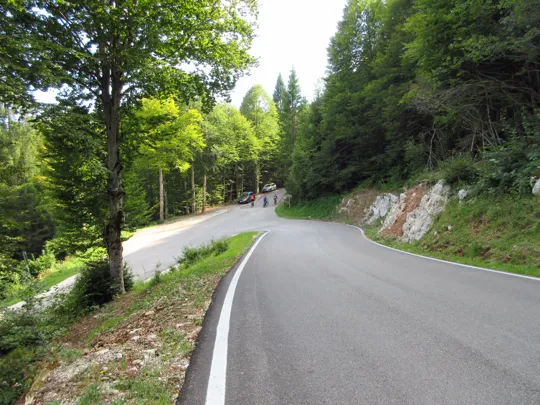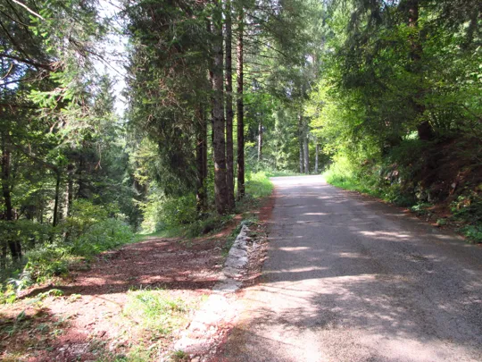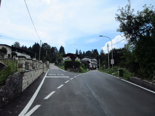 La strada asfaltata termina in un tornante di una strada bianca. Si prosegue ancora verso sinistra e sempre in salita.