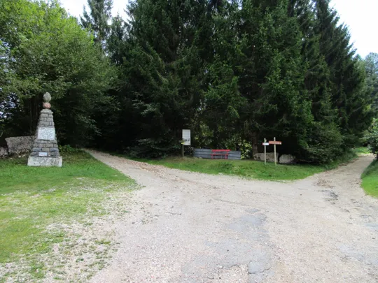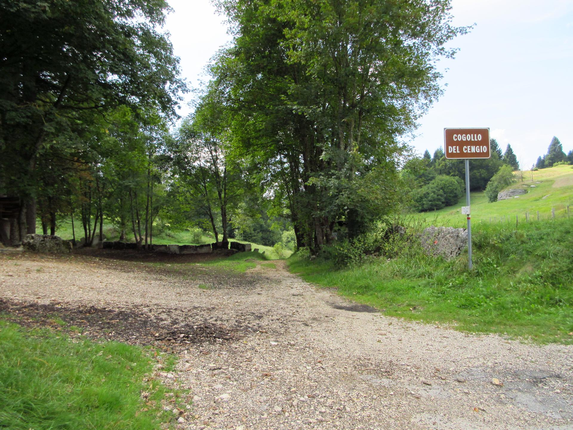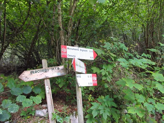 Percorsi circa 400 metri dopo il tornante, una strada sterrata sale verso sinistra. La tabella indica "Monumento Bignami" e "Cesuna".