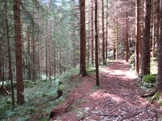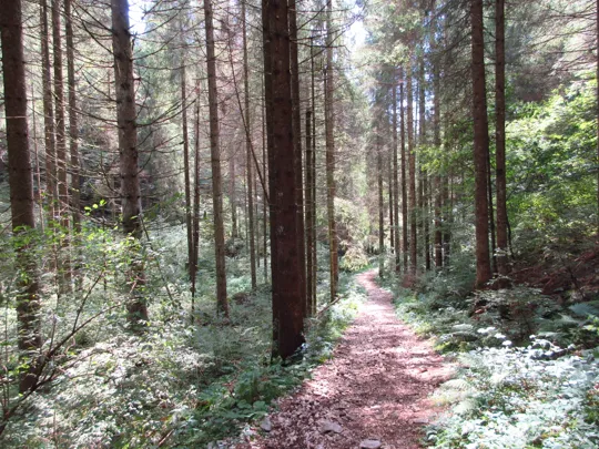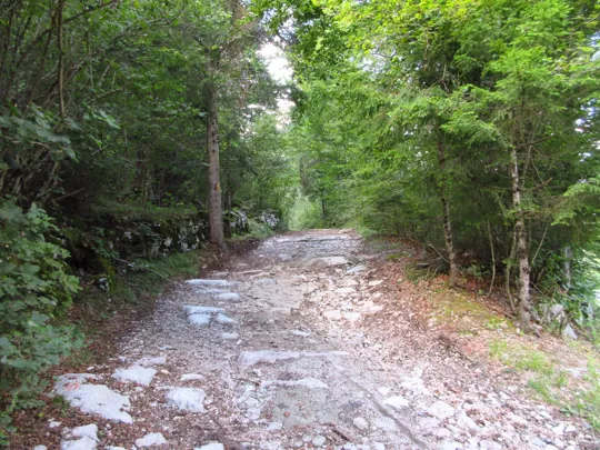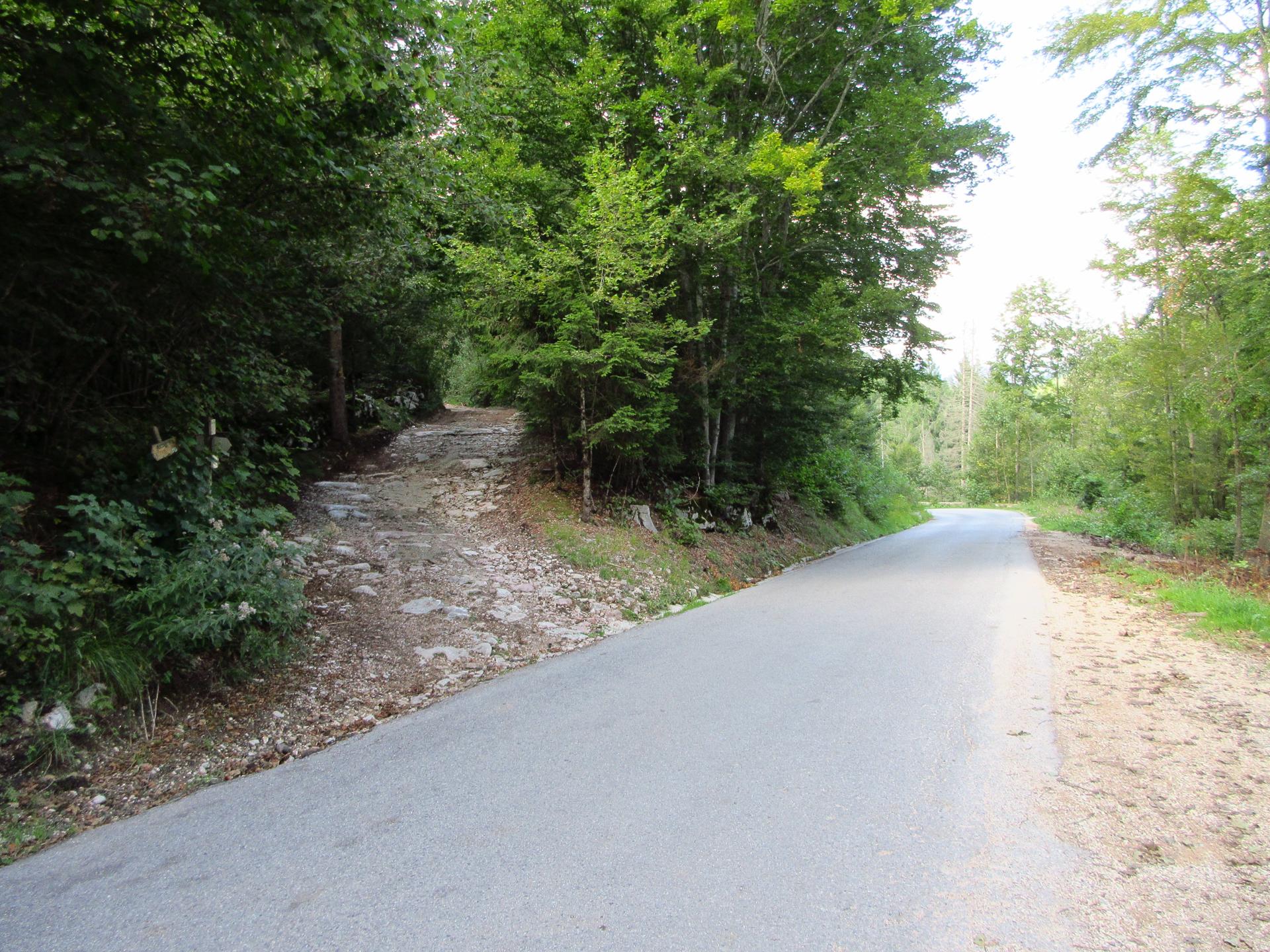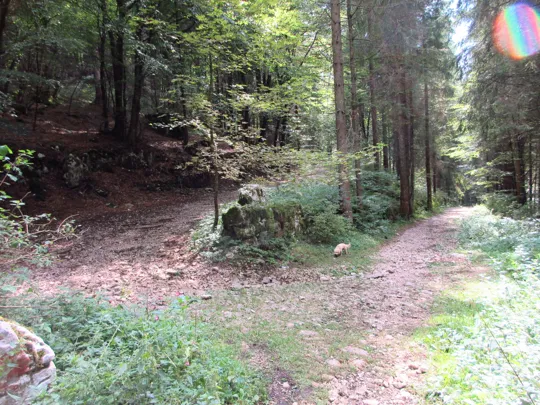 Dopo due tornanti il sentiero interseca un tornante di una strada sterrata e si prosegue in salita lasciando il segnavia 666.