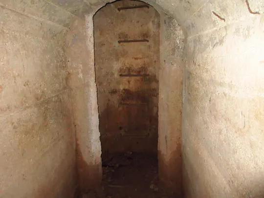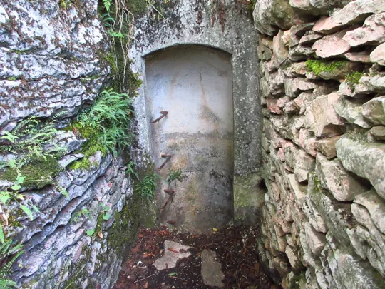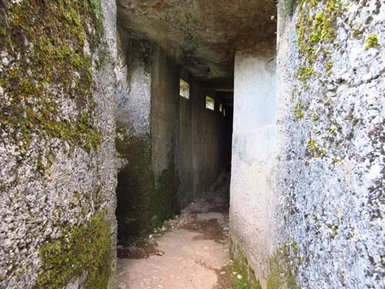 Particolare la postazione per mitragliatrice dove, per accedervi, si entra su di un cunicolo con una scalinata in ferro per poi percorrere pochi metri in grotta e quindi risalire alla postazione ... Costruzione del tutto inutile e di difficile utilizzo, ma forse è servita per occupare i militari in attesa.