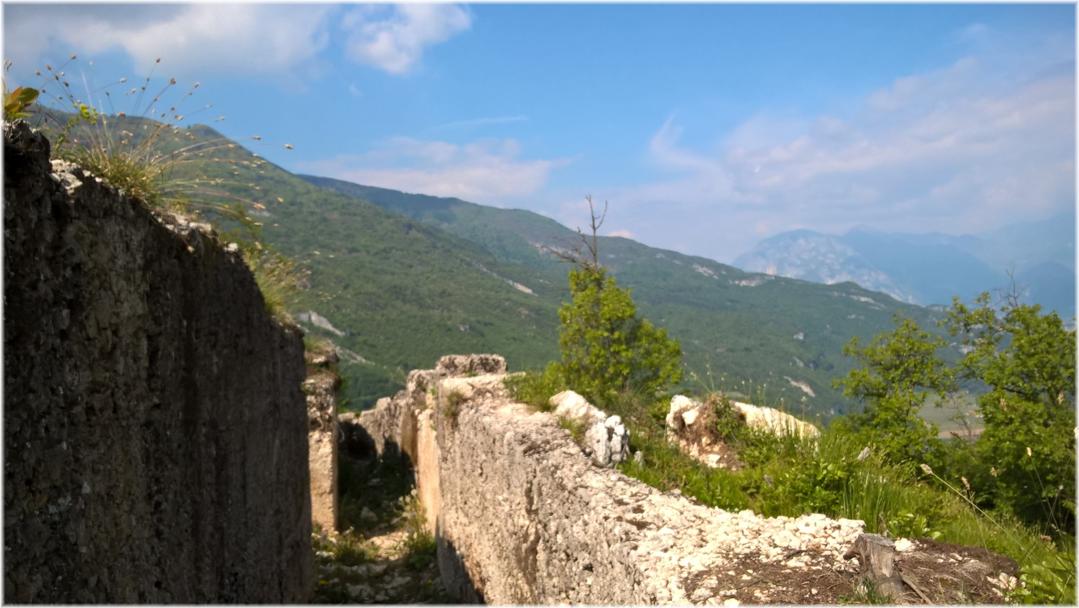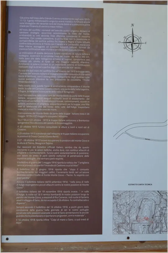 Con l'occupazione della zona nord del Monte Baldo da parte delle truppe italiane, vengono quindi eseguiti molteplici lavori di adattamento del territorio ad uso bellico. Si costruiscono trincee, camminamenti, ricoveri in galleria, postazioni di artiglieria, acquartieramenti per le truppe, una fitta rete di teleferiche che dal fondo della valle dell'Adige trasportavano viveri e materiali fin sulle cime dei monti.