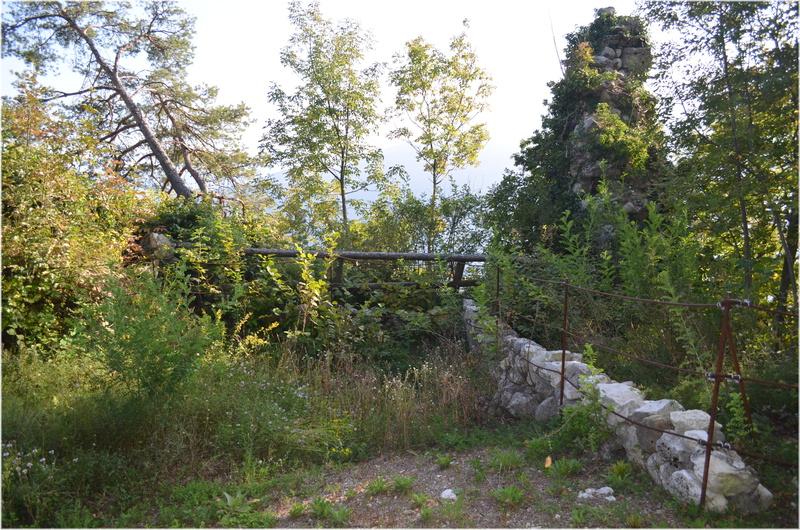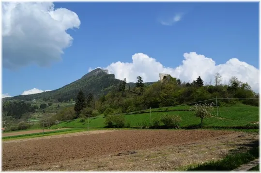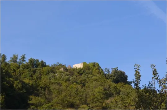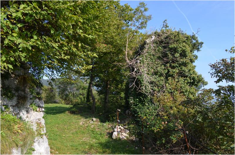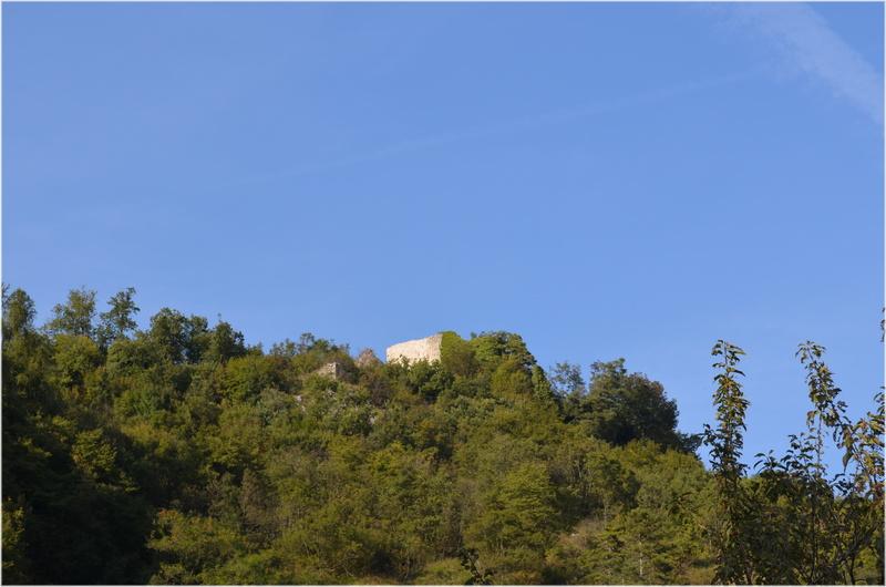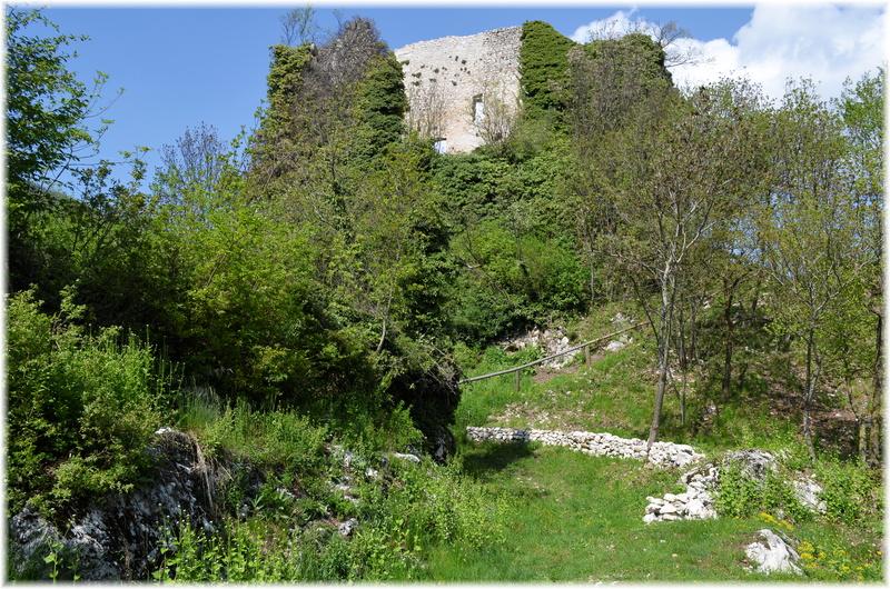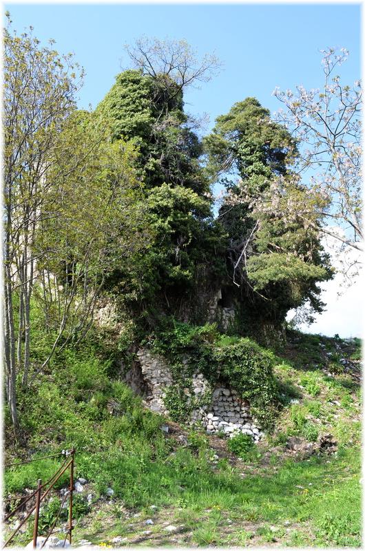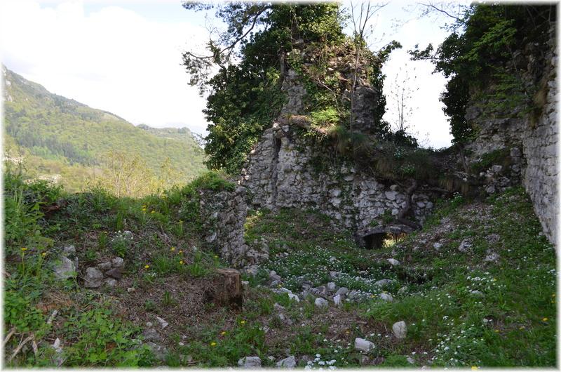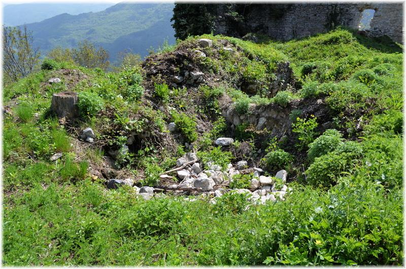 All'interno abbiamo un primo spazio del castello con mura diroccate sparse attorno e più sopra le mura del mastio del castello