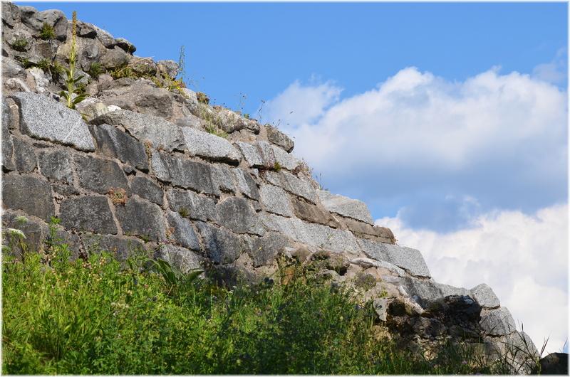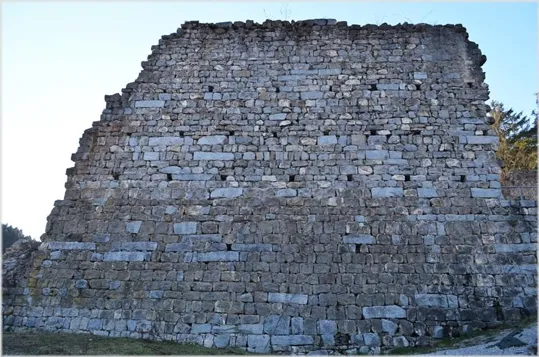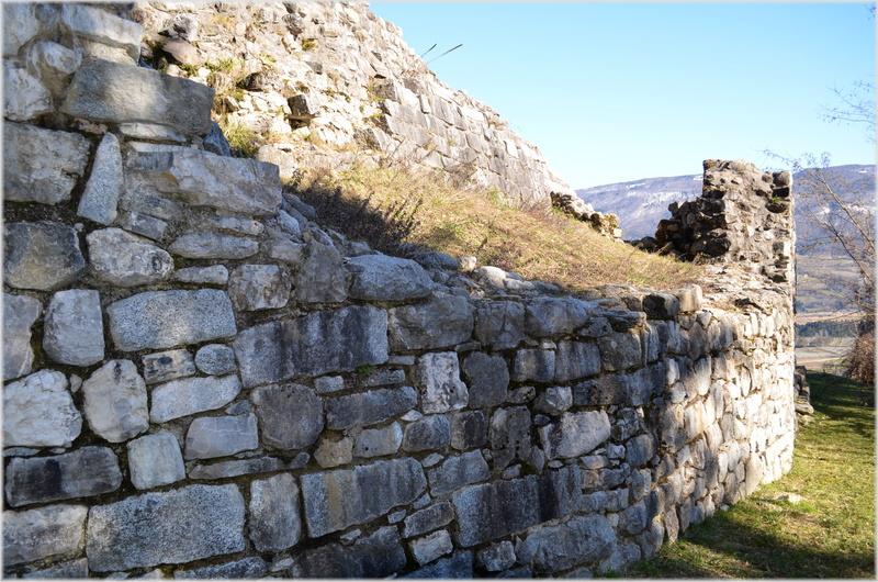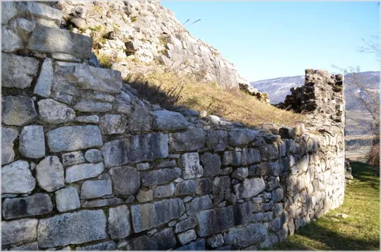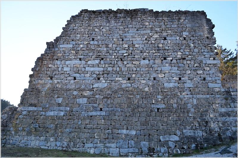 In alcune zone, dove ancora integra, la cinta muraria mostra tutta la sua altezza e la sua imponenza. Le mura sono costituite da due muri contrapposti riempiti da materiale di contenimento come sassi e pietre, osservando bene si nota che le mura sono state innalzate in due tempi successivi.