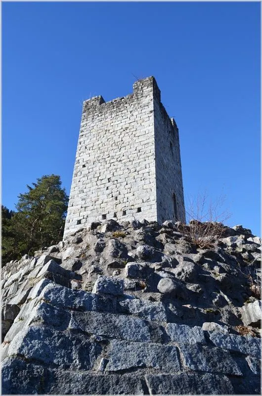 Di impronta militare, il castello presenta una torre quadrangolare ancora intatta, di sette metri per lato e quindici metri di altezza, circondata da una doppia muraglia con andamento curvilineo, in alcune zone saccheggiata per la costruzione degli edifici successivi. La torre é costruita con conci squadrati in granito. La tradizione vuole che nel XIV secolo, dopo i frequenti e ormai consueti scontri tra i conti d'Arco e i conti Campo da una parte e i conti Lodron dall'altra, il maniero divenisse ricettacolo di banditi, la strada di accesso era infatti chiamata la "Strada dei ladri".