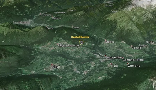 Il Castel Restor si trova nel Trentino meridionale, nelle Alpi Giudicarie, comune di Comano Terme, vicino alla frazione di Vergonzo.