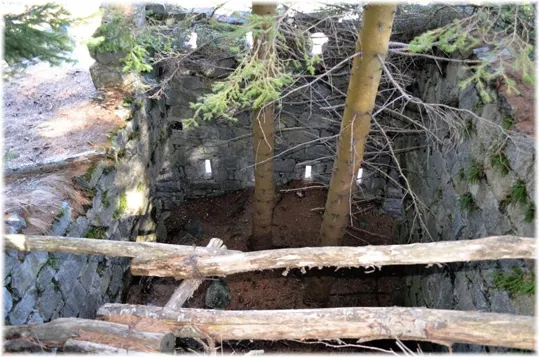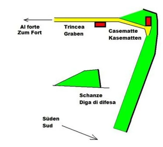 La trincea difensiva e il fortino sono molto ben visibili. Da una prima analisi effettuata dal prof. Volker potrebbero essere stati costruiti in due periodi diversi. Lo dimostrerebbero i materiali: il granito scolpito a mano, che si nota, ad esempio, nelle fuciliere, la malta e il legno utilizzati nella prima fase napoleonica, e il calcestruzzo armato con il ferro introdotto con le modifiche apportate nel 1915. La pianta del fortino era a base rettangolare (30 metri di lunghezza per 5 di larghezza) e all'interno, sul bordo nord-est del perimetro si trova tuttora il fortino-casema, con il lato ovest completamente interrato.