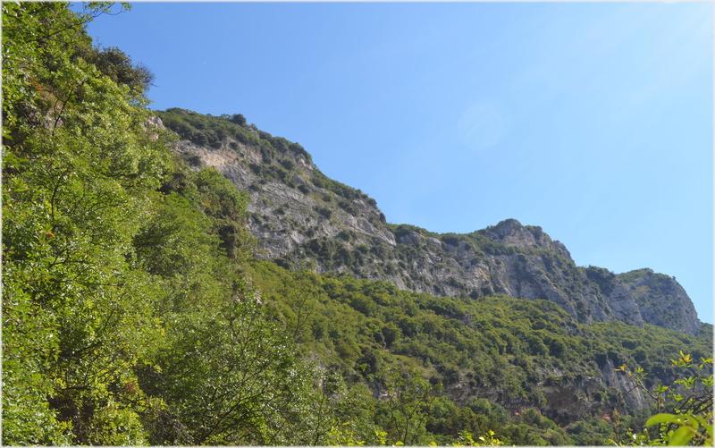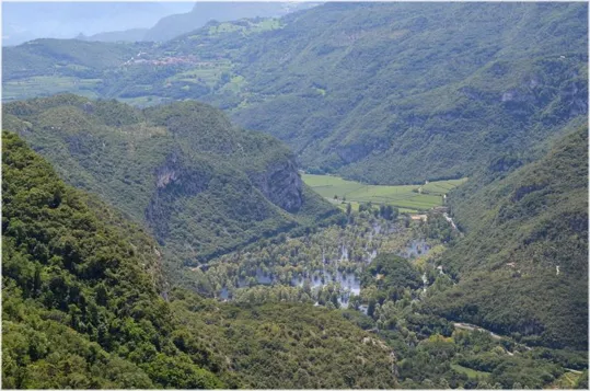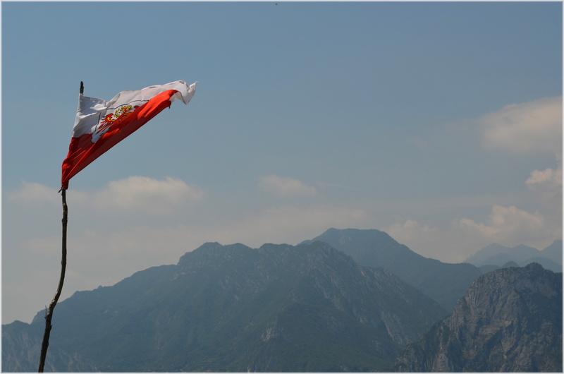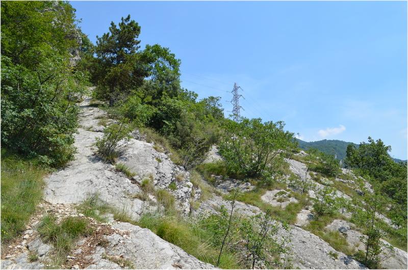 Siamo sul Monte Corno di Nago per una escursione su un itinerario poco conosciuto ma che ha molta storia da raccontare e che in questi ultimi anni é stato riportato alla luce, anche grazie al lavoro di associazioni di volontari. In questa foto si riesce a notare la trincea più bassa dove c'é la bandiera, la postazione Perlone e la trincea della Salina