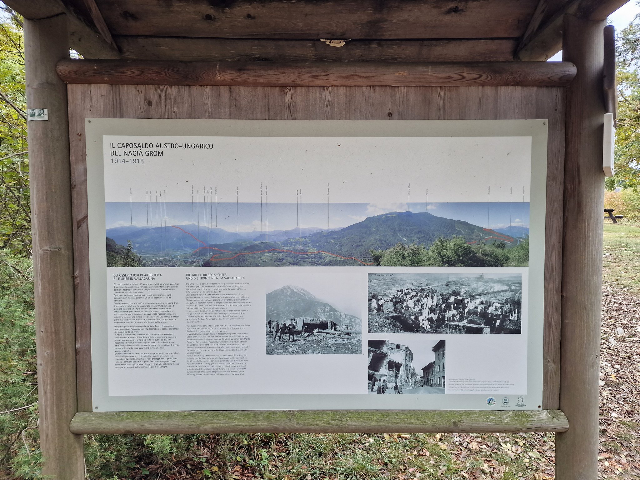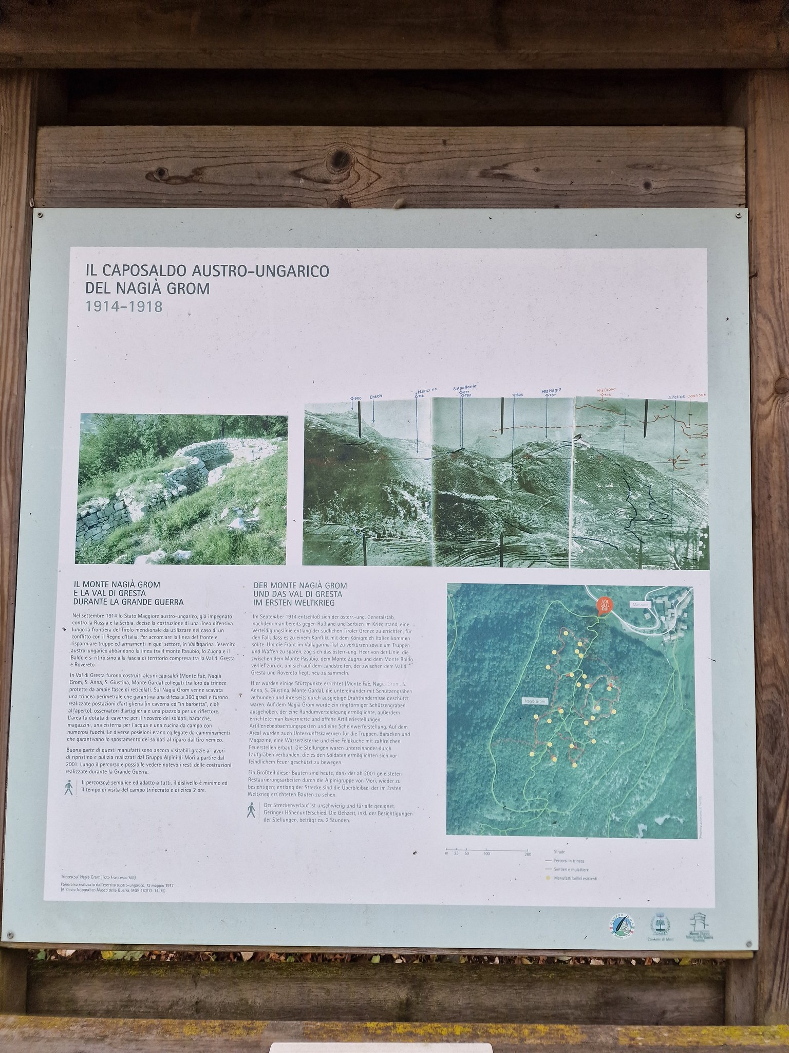 Iniziamo con un piccolo ringraziamento agli alpini di Mori, che con il loro lavoro, hanno reso e rendono possibile, immergersi nella storia, con la possibilitá di capire come era strutturato il Campo trincerato Nagiá Grom e offrendo da questi luoghi la possibilitá di ammirare dei panorami molto belli, ma anche panorami sulla grande guerra. Il percorso é molto bello e ad ogni postazione é presente una targa con la denominazione esatta, quindi é facile capire cosa si sta visitando.