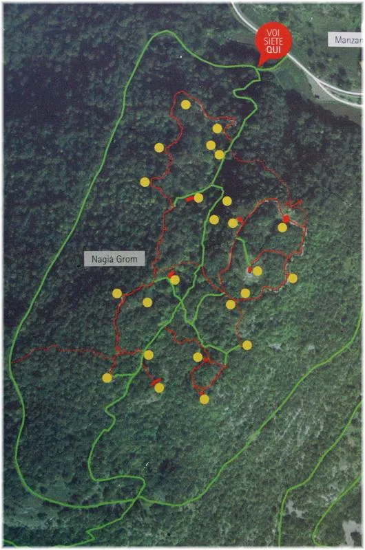 Campo trincerato Nagiá Grom - tabella dei percorsi - in giallo le postazioni, le linee rosse sono le trincee e i percorsi verdi sono le mulattiere