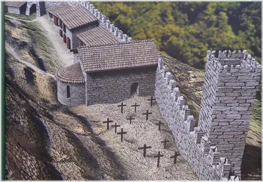 In questa ricostruzione grafica si può confrontare l'aspetto che doveva avere la chiesa e quello che ne resta