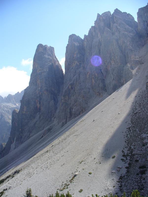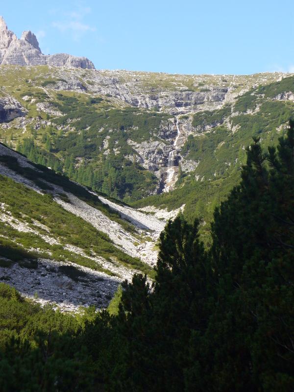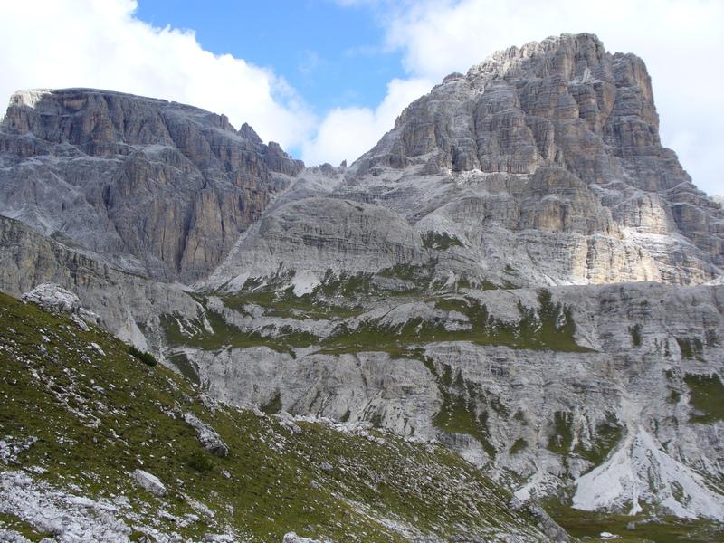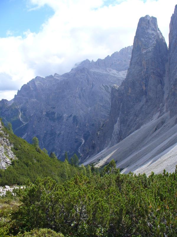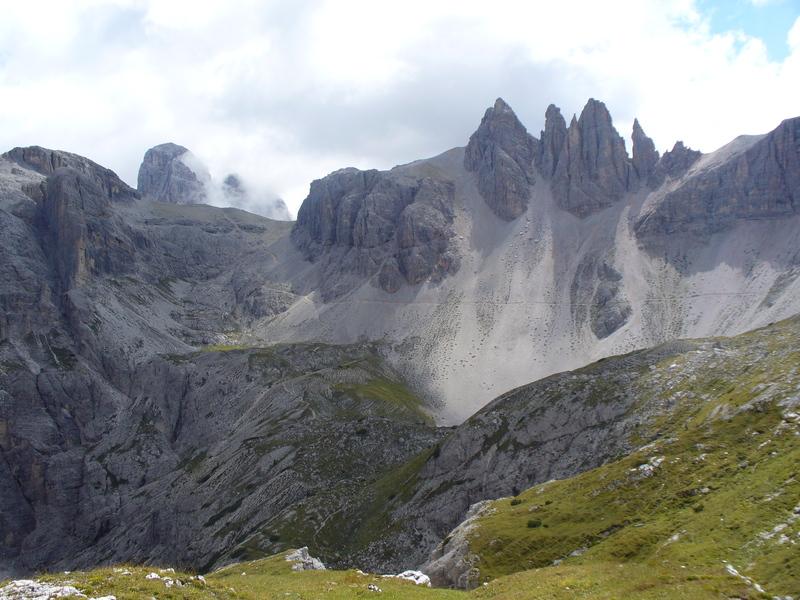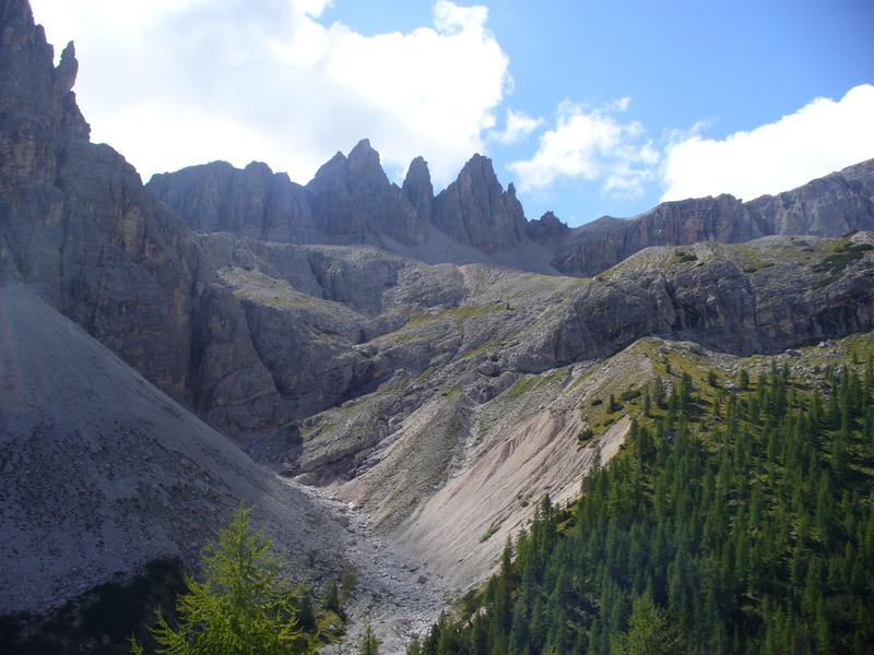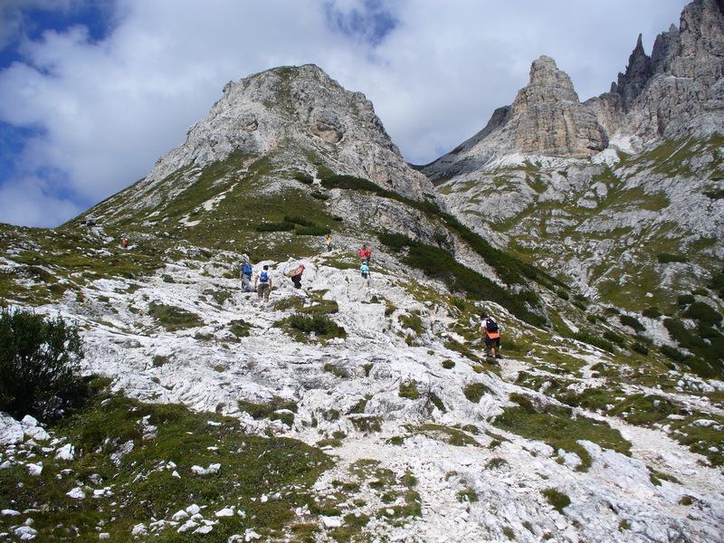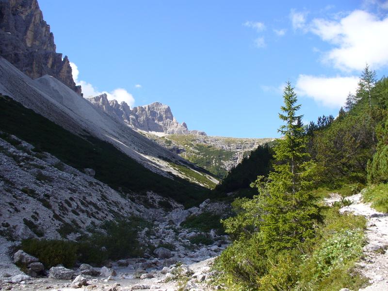Salendo abbiamo a destra prima le pendici di Punta Slavina Lunga e poi quelle di Sassovecchio mentre a sinistra abbiamo Cima Una e le Crode Fiscaline.