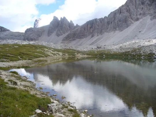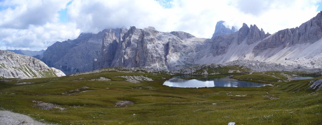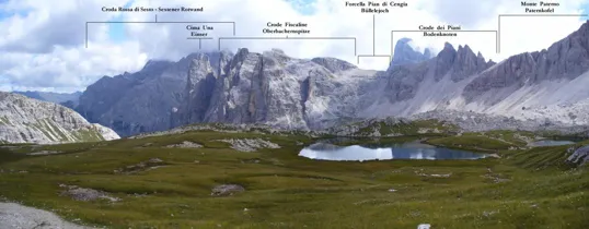 Da uno dei laghetti dell'Alpe dei Piani, da sinistra: Croda Rossa, Cima Una, Crode Fiscaline, Forcella Pian di Cengia, Croda dei Toni e Crode dei Piani
