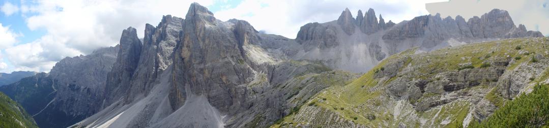 Panorama dall'Alpe dei Piani con vista da sinistra sulla Croda Rossa, Cima Una, Crode Fiscaline, Forcella Pian di Cengia, Crode dei Piani e Monte Paterno