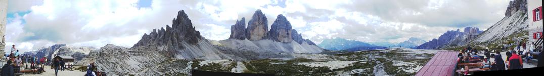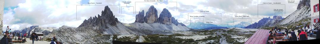 Panorama dal rifugio Locatelli, da sinistra: Monte Paterno, Forcella Lavaredo, Tre cime di Lavaredo, Monte Cristallino di Misurina con sotto il Monte Piana, per finire la Torre dei Scarperi davanti alla Croda dei Rondoi, in ultima i pendii del Sasso Di Sesto