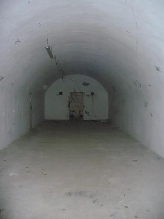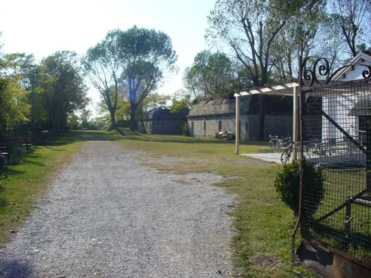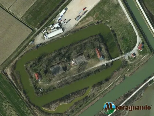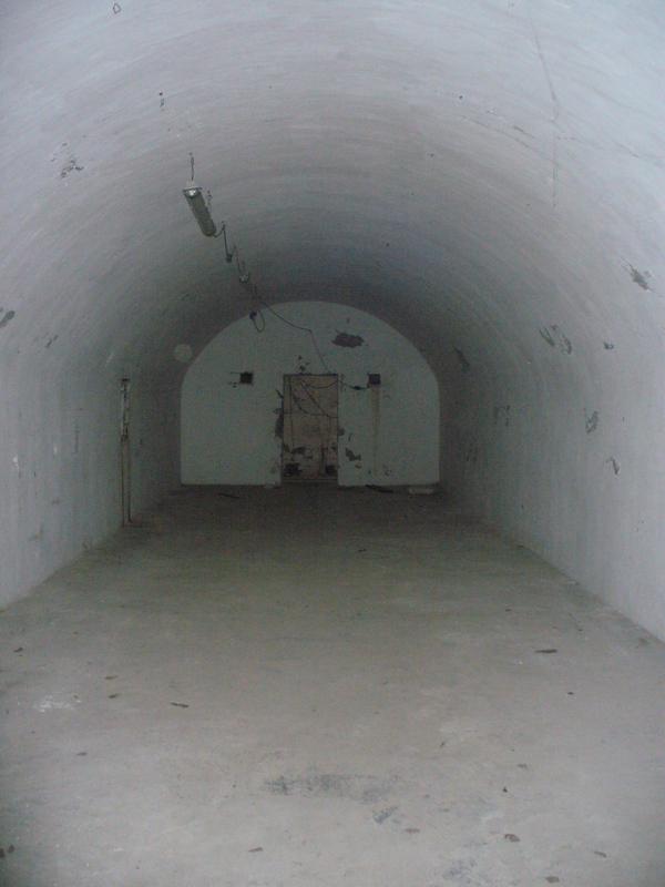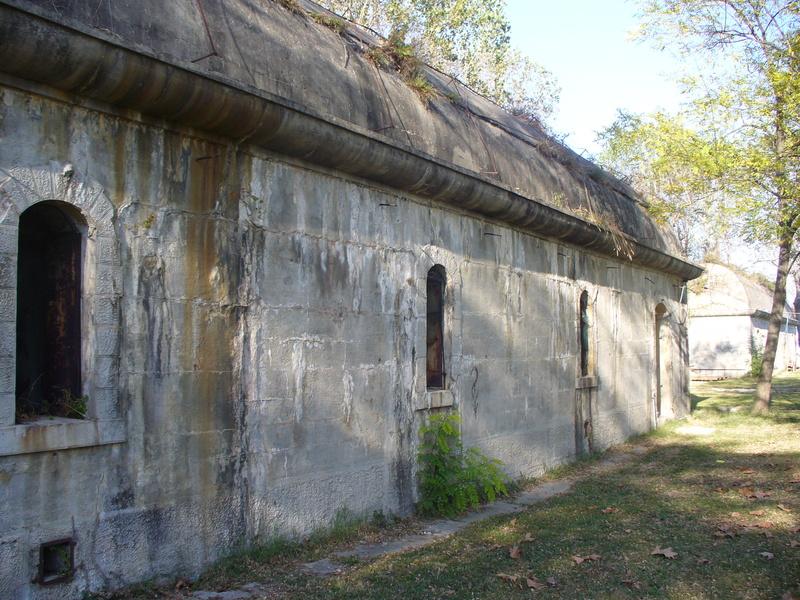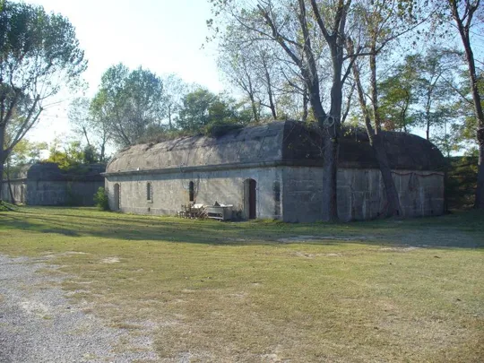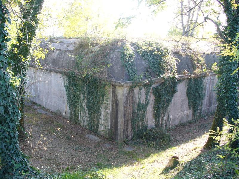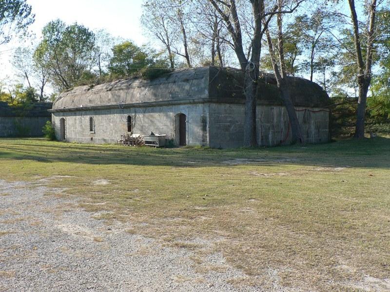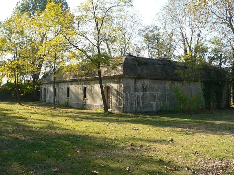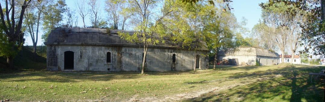 In questa vista d'insieme si possono vedere le due polveriere, dietro si nota l'argine di protezione, mentre tutta a destra la caserma del posto di guardia.