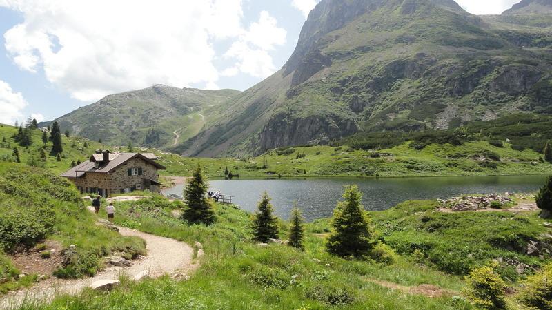 Riusciamo a scorgere un lago e il tetto del rifugio. In mezz'ora di cammino, si giunge al rifugio "Laghi di Colbricon" che sorge accanto a questi due piccoli e caratteristici laghi.
