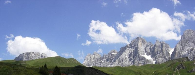 da destra il Castelaz e l'inizio del gruppo delle Pale di San Martino, visti da Malga Rolle.