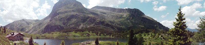 Panoramica con vista sul rifugio, il lago e il Colbricon.