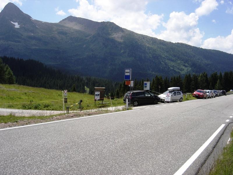 Dal parcheggio vicino a Malga Rolle si vede la strada sterrata che parte dalla SS50, sullo sfondo le cime di Colbricon