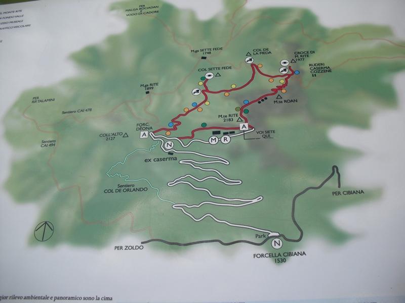 É possibile inoltre aggirare la cima del Monte Rite in un percorso che porta fino alla croce. Lungo il sentiero sono visibili ancora tracce della Grande Guerra e i ruderi della caserma Cozzene.