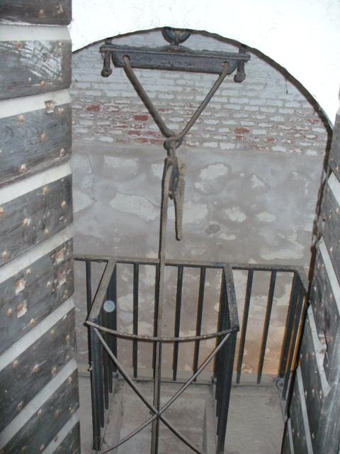 Montacarichi delle munizioni. Dai depositi, i proietti, attraverso i corridoi giungevano fino al montacarichi e da qui salivano ai cannoni. Questo avveniva tramite una semplice fune azionata a mano, collegata ad una puleggia.
