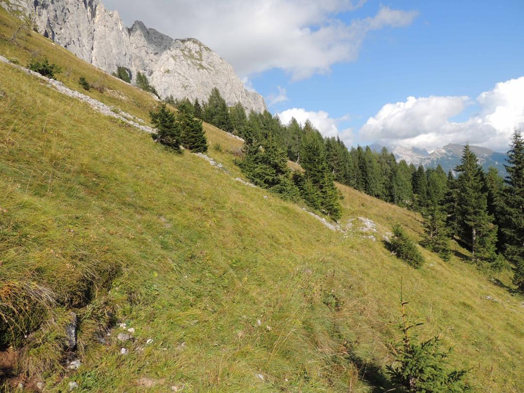 il sentiero a mezza costa procede verso un affioramento roccioso