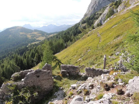 Per il ritorno è possibile seguire il camminamento in trincea che ritorna verso il Presidio Secondario e ricollegarsi poi al sentiero dell'andata che corre qualche metro più in alto.