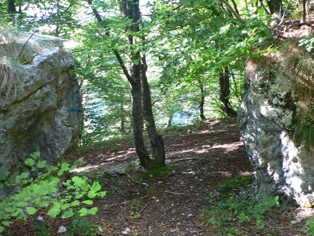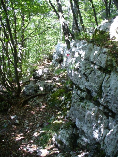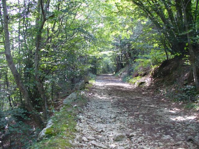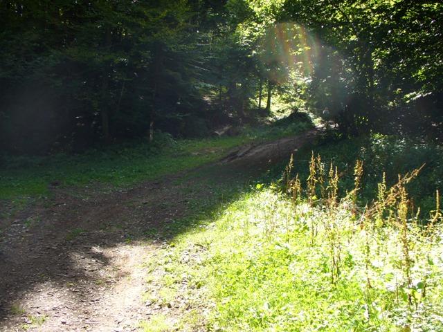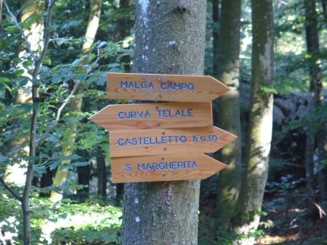 Il percorso si snoda verso Ovest rimanendo sempre nel bosco e dopo una radura la strada diventa un sentiero che sale con poco più impegno. Non mancano le indicazioni che ci guidano.