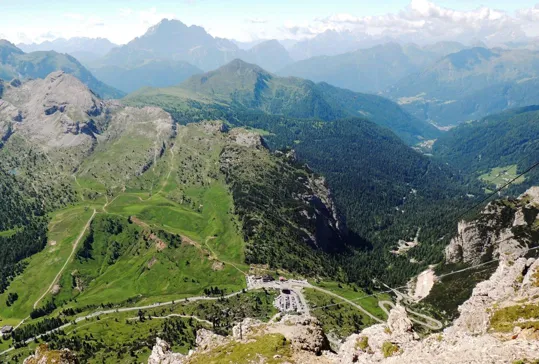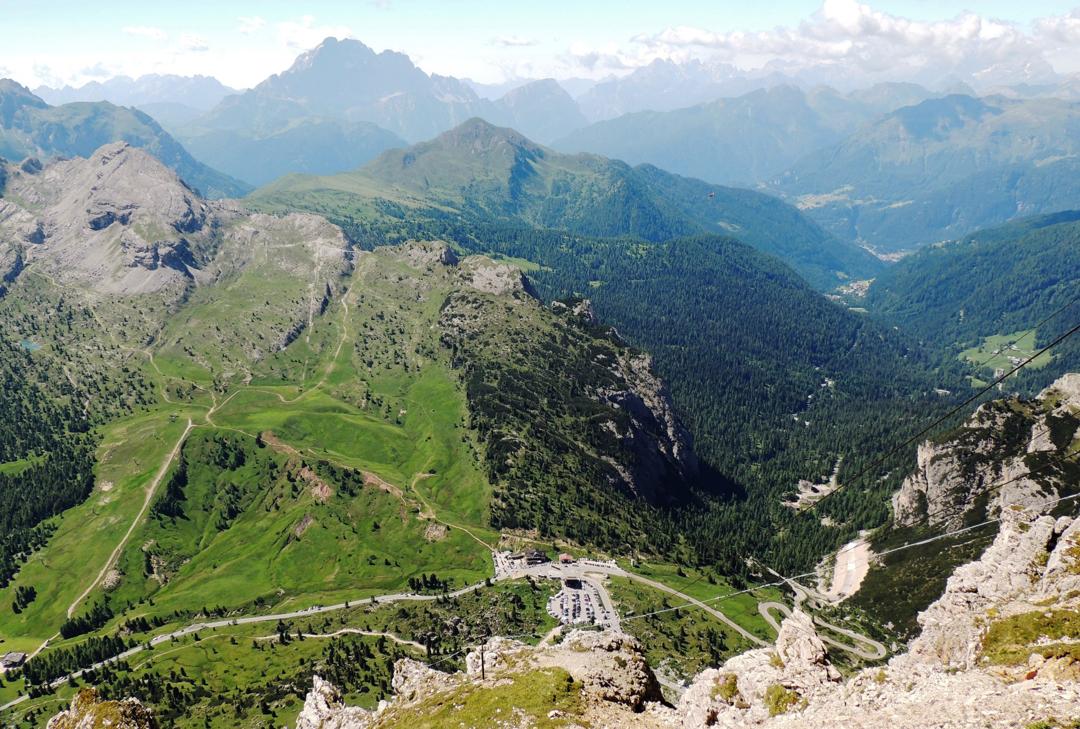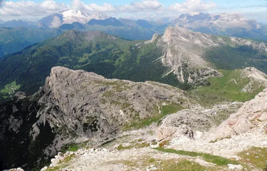 La Marmolada, il Col di Lana e il Sasso di Stria, sulla destra il gruppo del Sella e davanti il Setsass