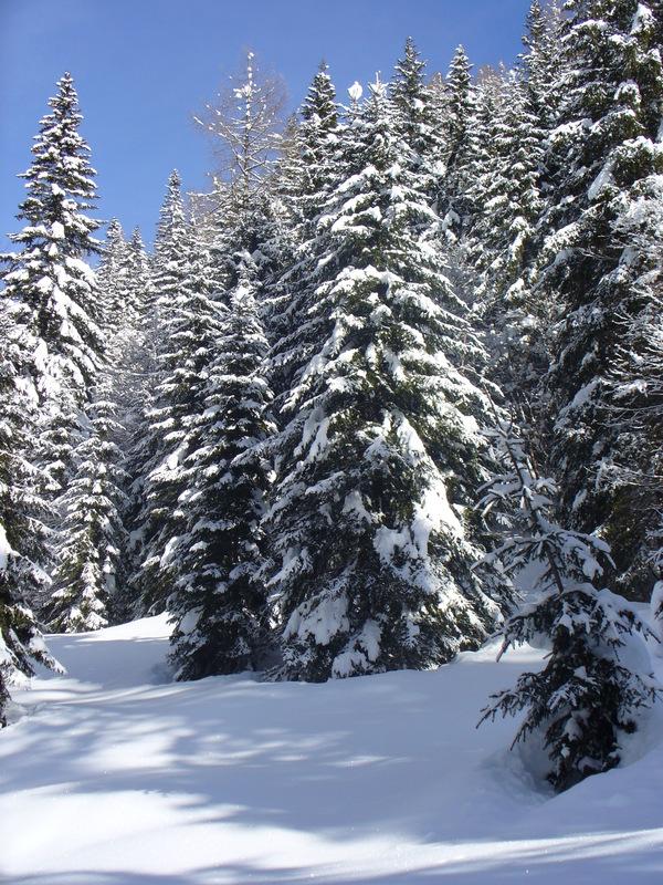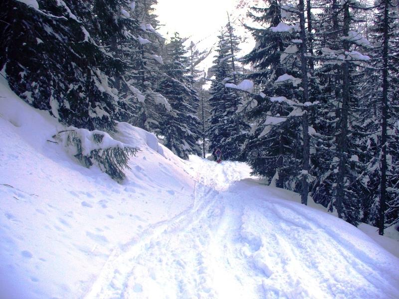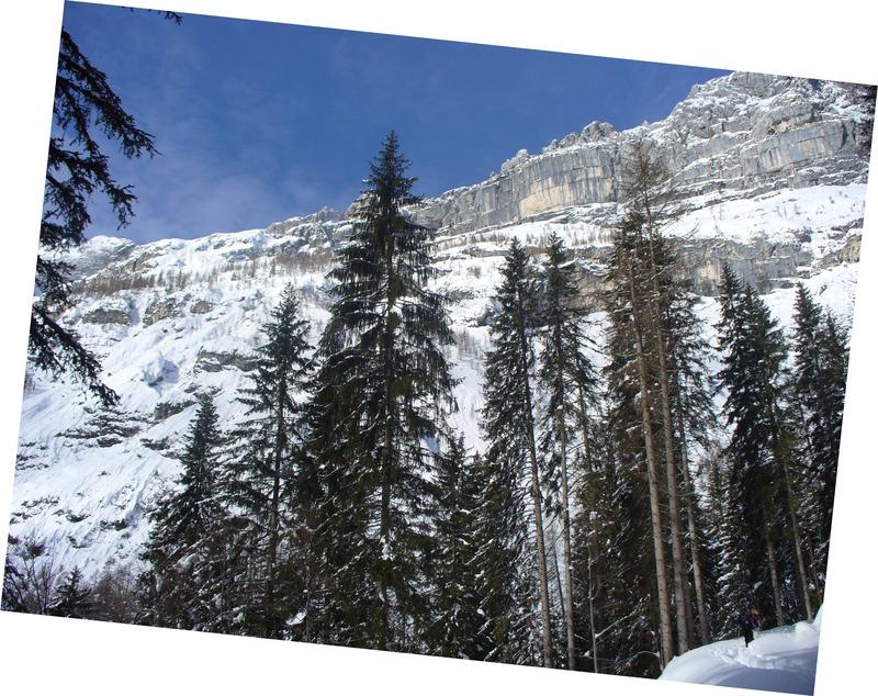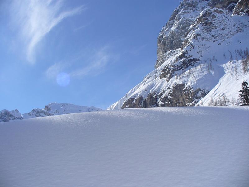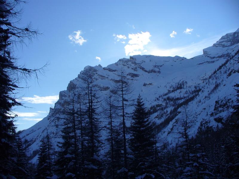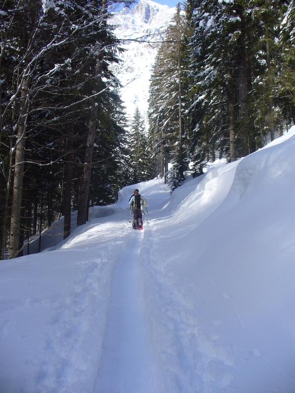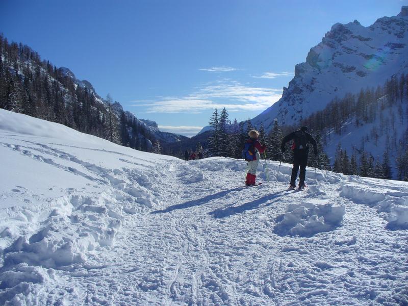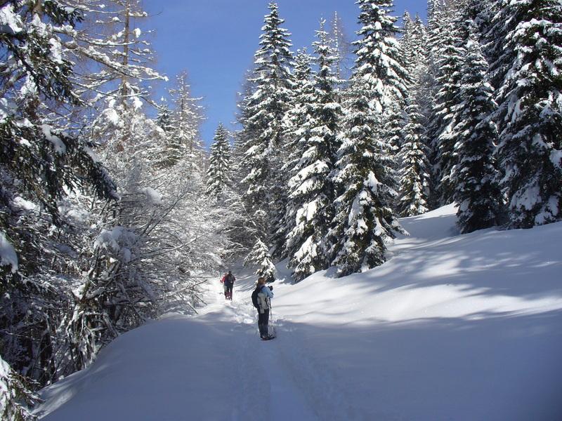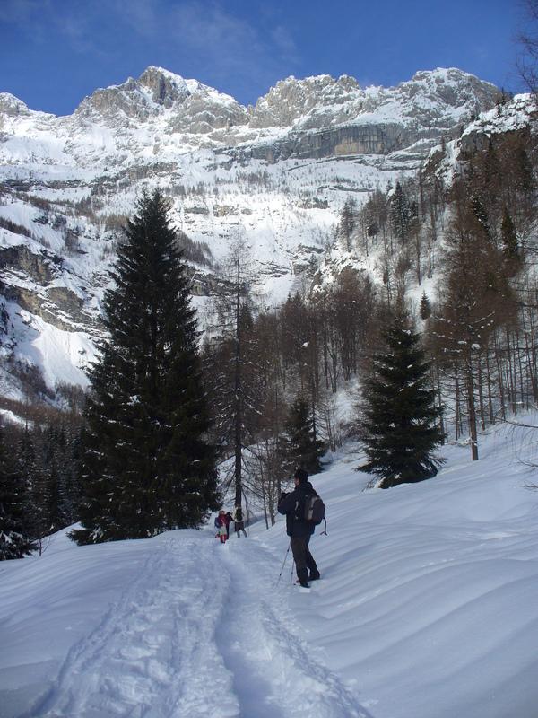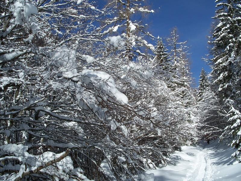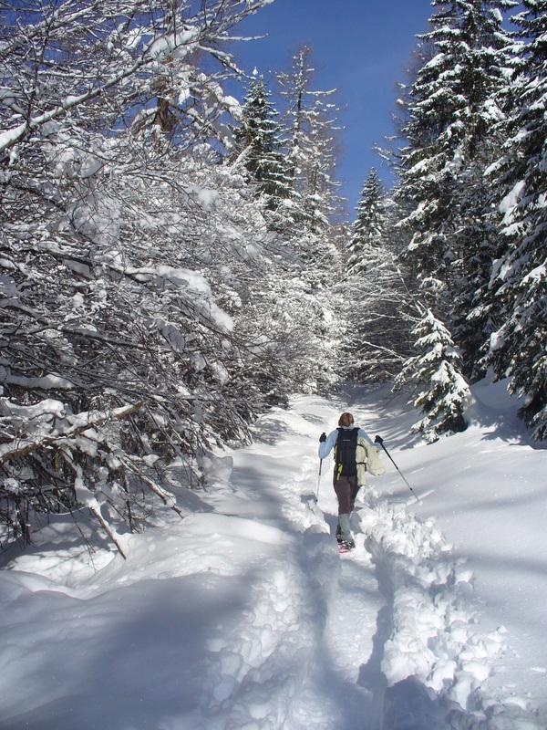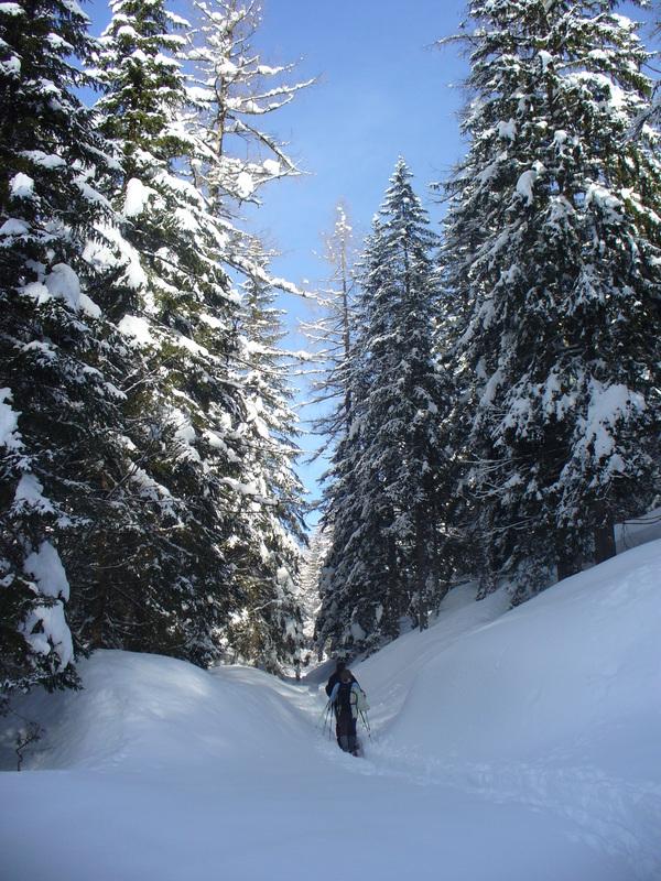 Parcheggiato l'auto al termine di Via Canzel Grant, prendiamo la strada intagliata nella neve che sale dolcemente sulla destra e appena superate le ultime case, la strada diventa una traccia nella neve e subito ci troviamo immersi nella natura.