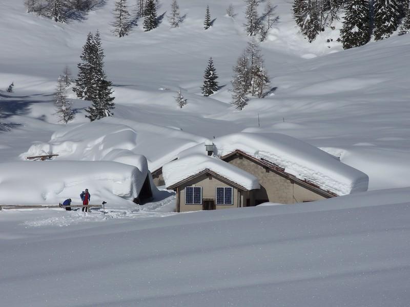 In nemmeno due ore e mezzo di ciaspolata si giunge in vista della Malga della Grava.