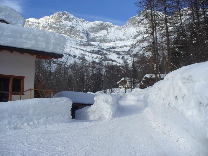 Il sentiero prosegue linearmente, costeggiando il Ru della Grava che scorre sotto la neve nel fondo valle alla nostra sinistra