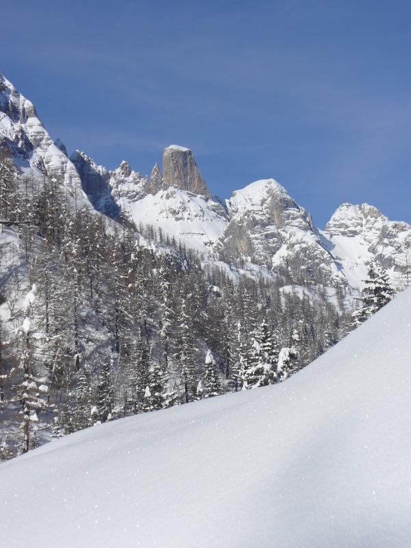 Il gruppo del Civetta-Moiazza, alla nostra sinistra, predomina e ci accompagna durante tutta la nostra escursione con le ciaspe.