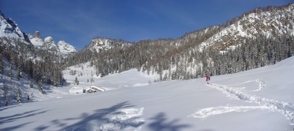 Con le racchette da neve, raggiungere la malga non è difficile, l'escursione è facile e priva di punti esposti e una volta raggiunta la conca si gode di uno spettacolo sul dolomitico gruppo del Civetta-Moiazza, dalla Torre di Coldai, al Civetta, fino al Moiazza Nord e Sud.