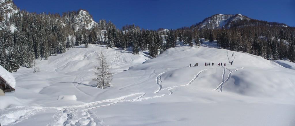 Il paesaggio che si apre sulla conca prativa completamente innevata regala uno spettacolo che appaga l'impegno.
