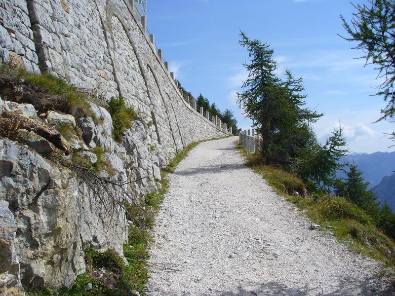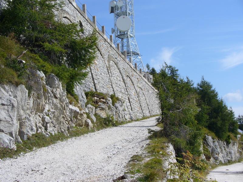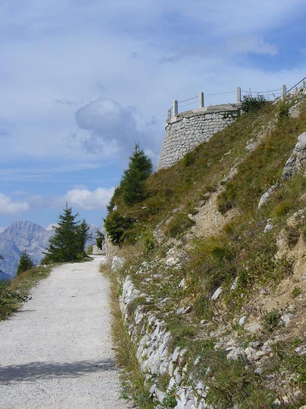 Salendo con pendenza costante, parecchi tornanti e qualche galleria, la strada sterrata attraversa il bosco, che da folto si dirada sempre piú. All'uscita dell'ultima galleria incrociamo la caserma della guarnigione del forte, segno che manca poco alla nostra meta.