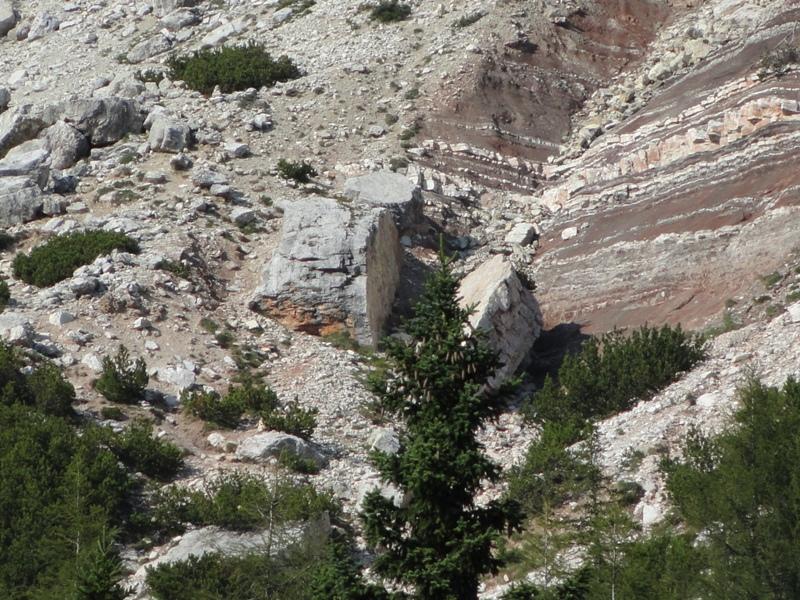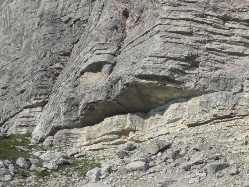 Dopo aver ammirato questo enorme blocco di Dolomia, possiamo guardarci attorno e notare come siano presenti diversi aspetti caratteristici. Dalla parete aggettante sopra di noi ai diversi strati geologici nel terreno lì vicino.