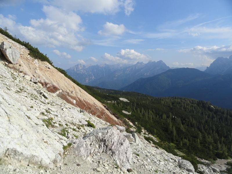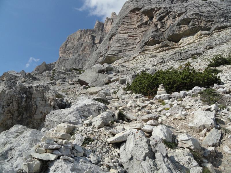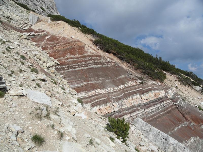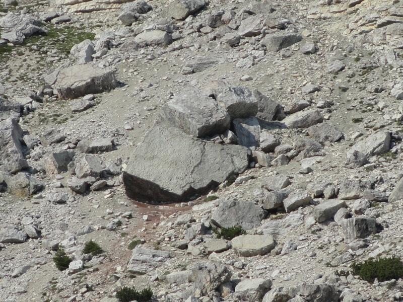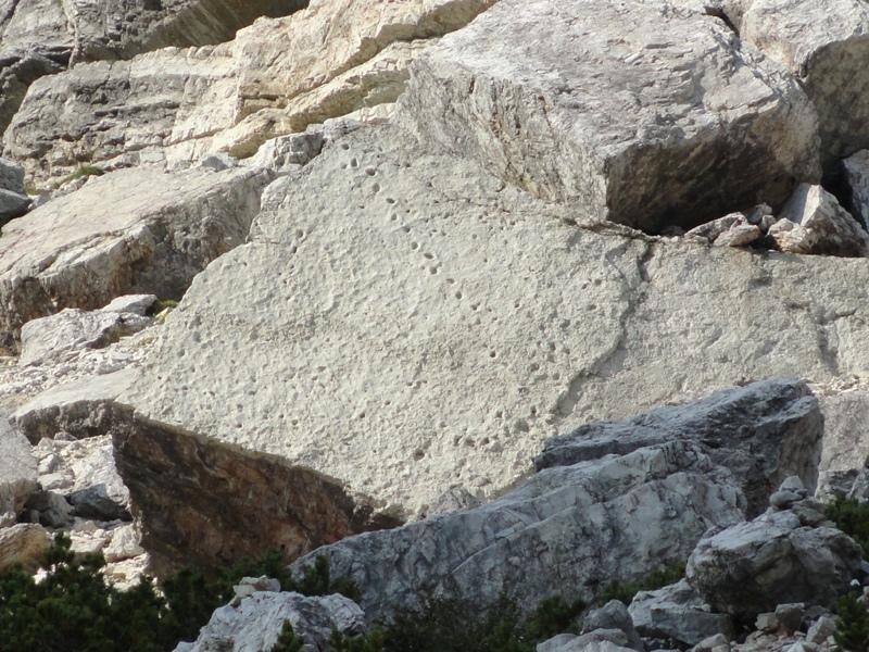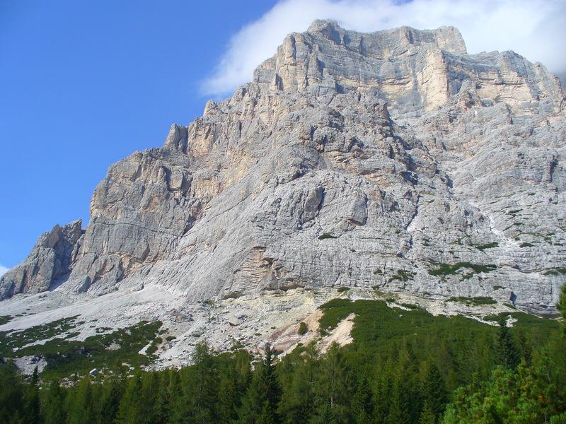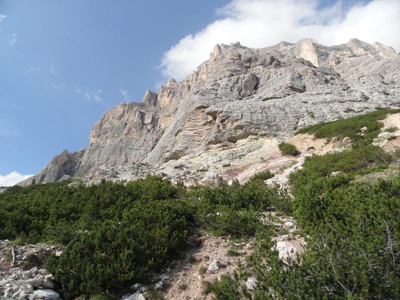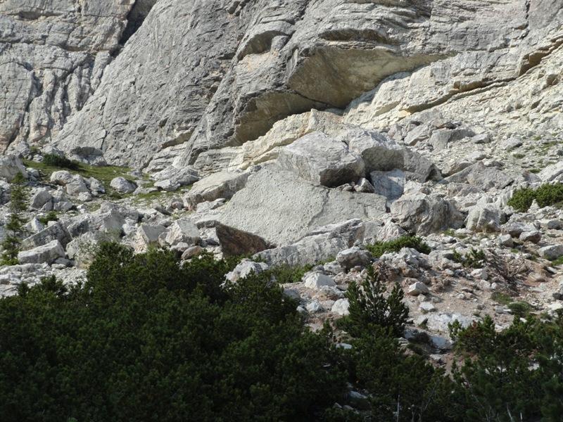 Lato Sud-Ovest del Pelmetto. Nel macereto (ghiaione) alla base é possibile scorgere il grande masso con le impronte dei Dinosuari.