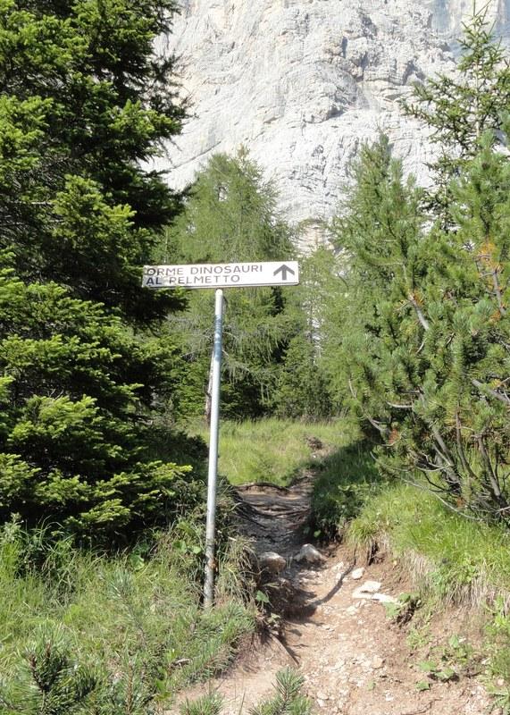 Dopo circa 40 minuti troviamo alla nostra sinistra l'indicazione del sentiero per le Orme dei Dinosauri, che sale direttamente verso il pendio.