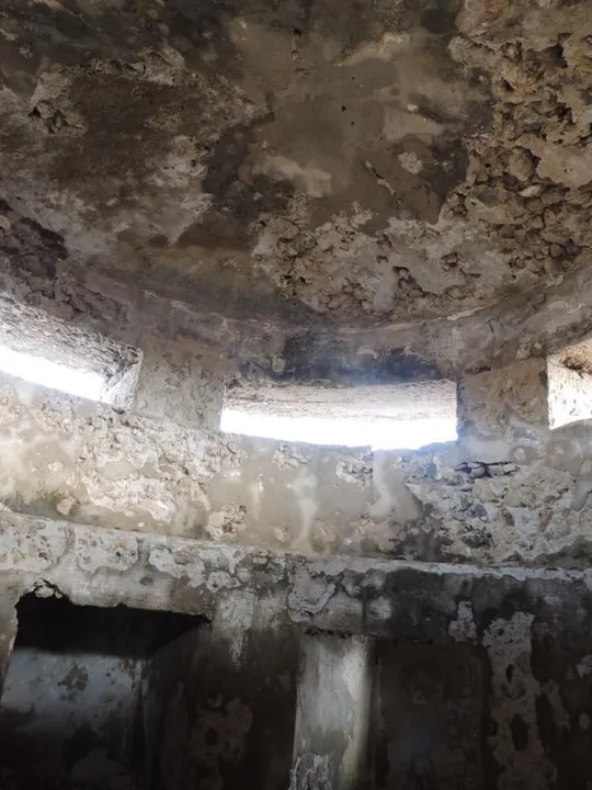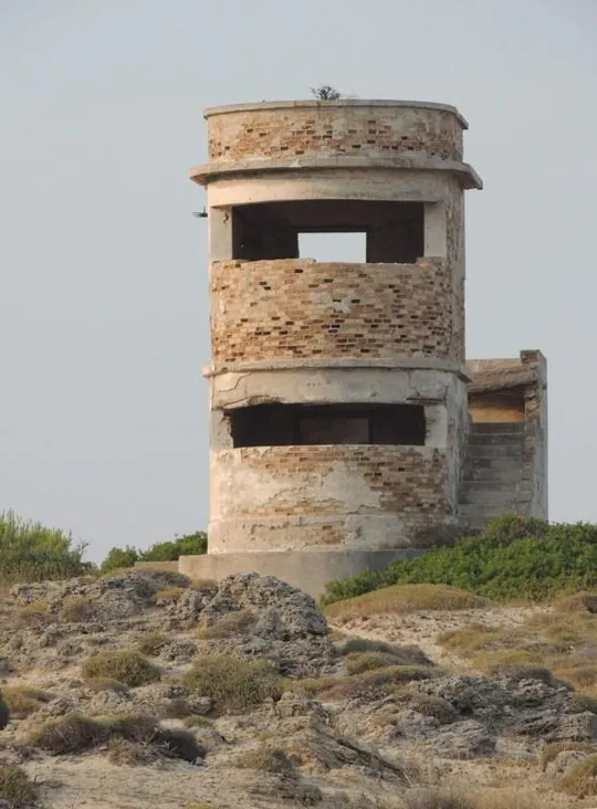 Le postazioni circolari monoarma spesso erano allertate da torrette di vedetta o P.O.C. Posti di Osservazione Costiera, poste poco più all'interno con lo scopo di avvistare il nemico, allertare il comando e coordinare le singole postazioni. Quella in queste immagini é doppia a due piani sovrapposti.